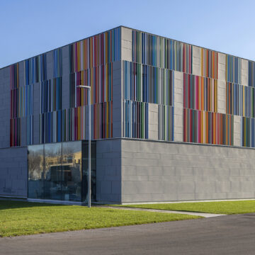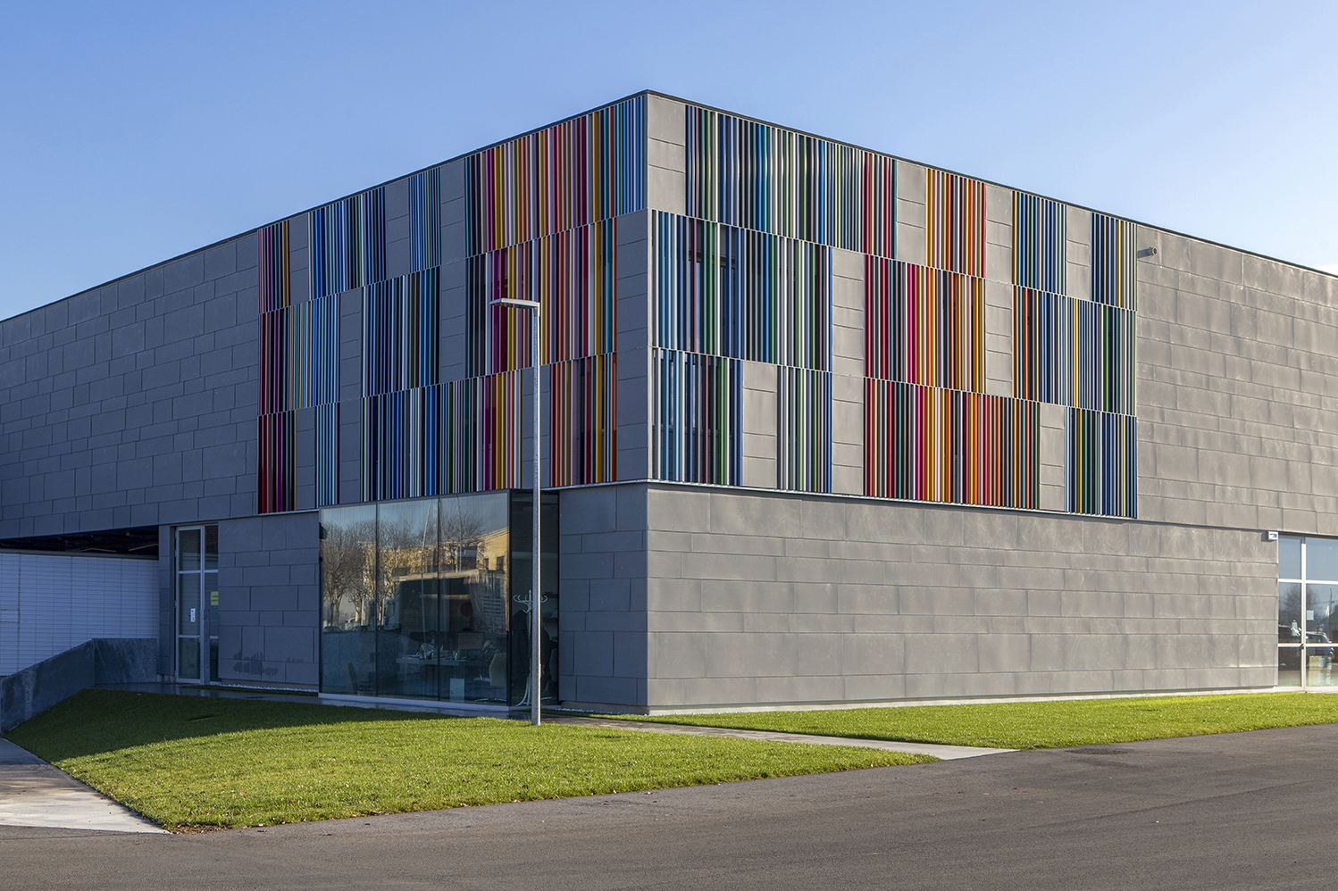 Il nuovo edificio affianca la LAGO Fabbrica, l’azienda di design guidata da Daniele Lago. La nuova struttura in legno è scandita da enormi vetrate con vista verso il Monte Grappa ed è dotata di un frangisole composto da 460 listelli di 58 colori diversi, ispirati all’opera di Gerhard Richter, che si alternano tra loro creando una gradazione di colori che cambia a seconda della luce del giorno e dei suoi riflessi.