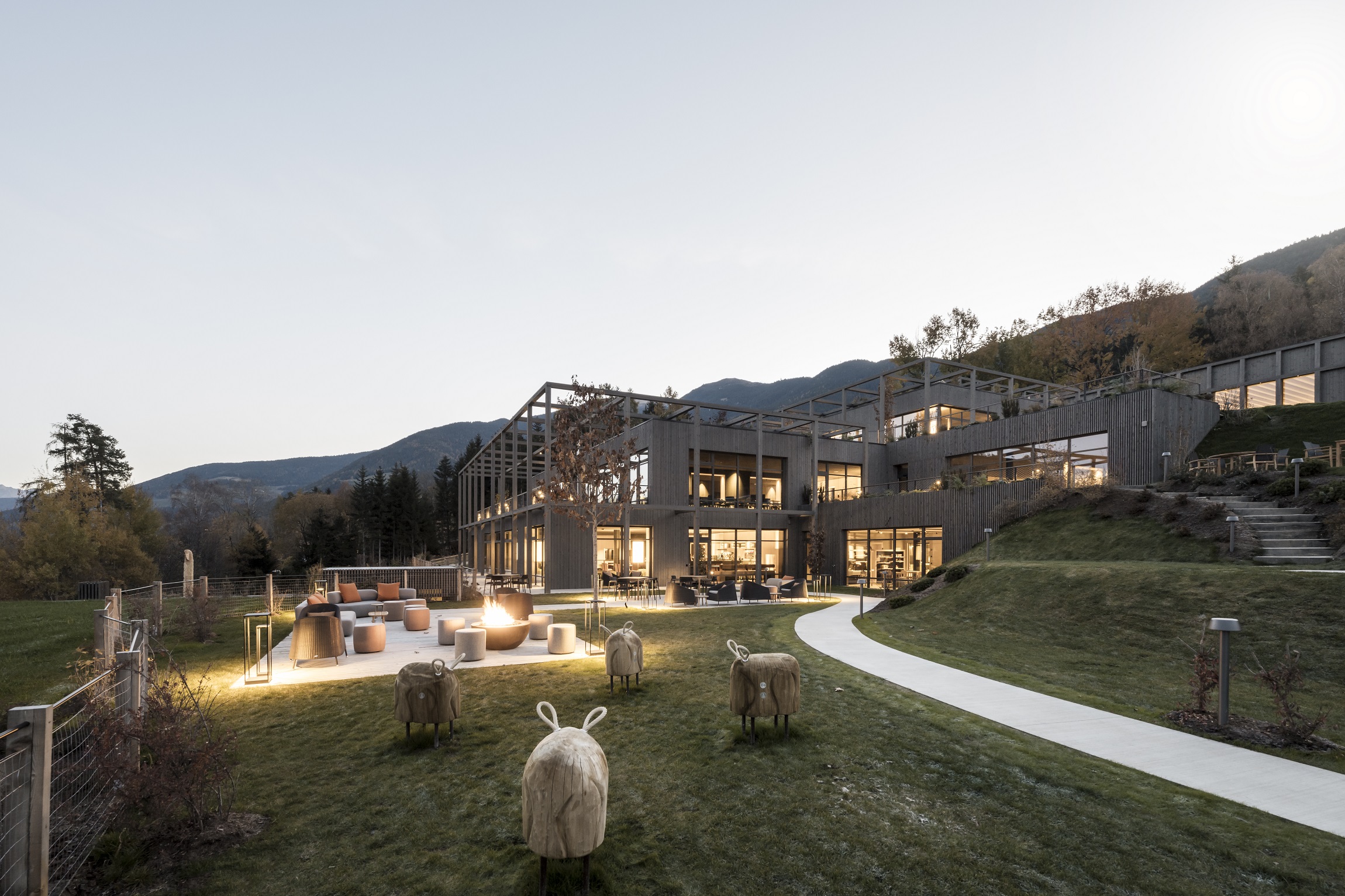 L’intervento, curato dallo studio G22 Projects in collaborazione con l’architetto Igor Comploi, si manifesta come un’architettura diffusa capace di assecondare l’andamento naturale del terreno grazie a volumi che quasi scompaiono nel contesto alpino. L’impiego di tetti ipogei ricoperti di vegetazione permette infatti alla struttura di mimetizzarsi nel bosco, riducendo al minimo l’impatto visivo sul paesaggio circostante.