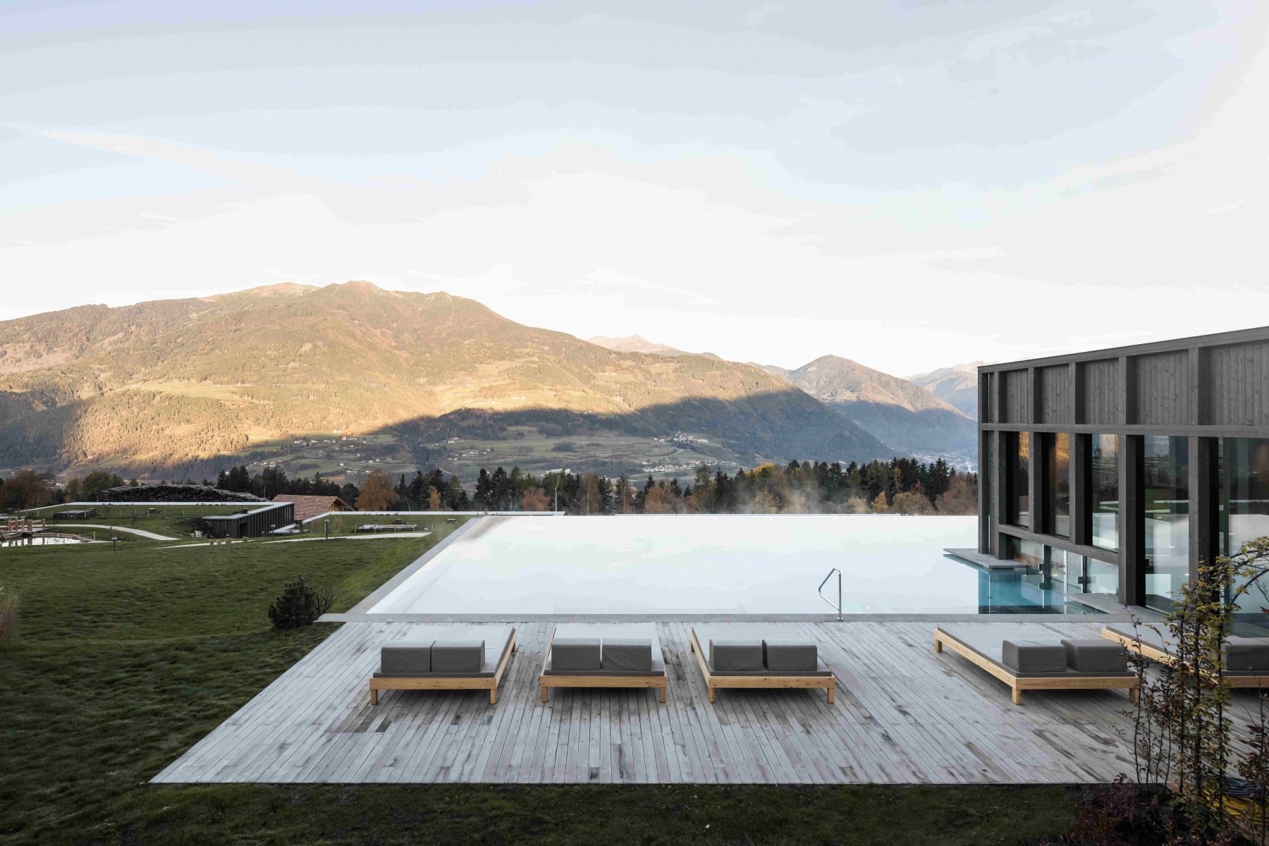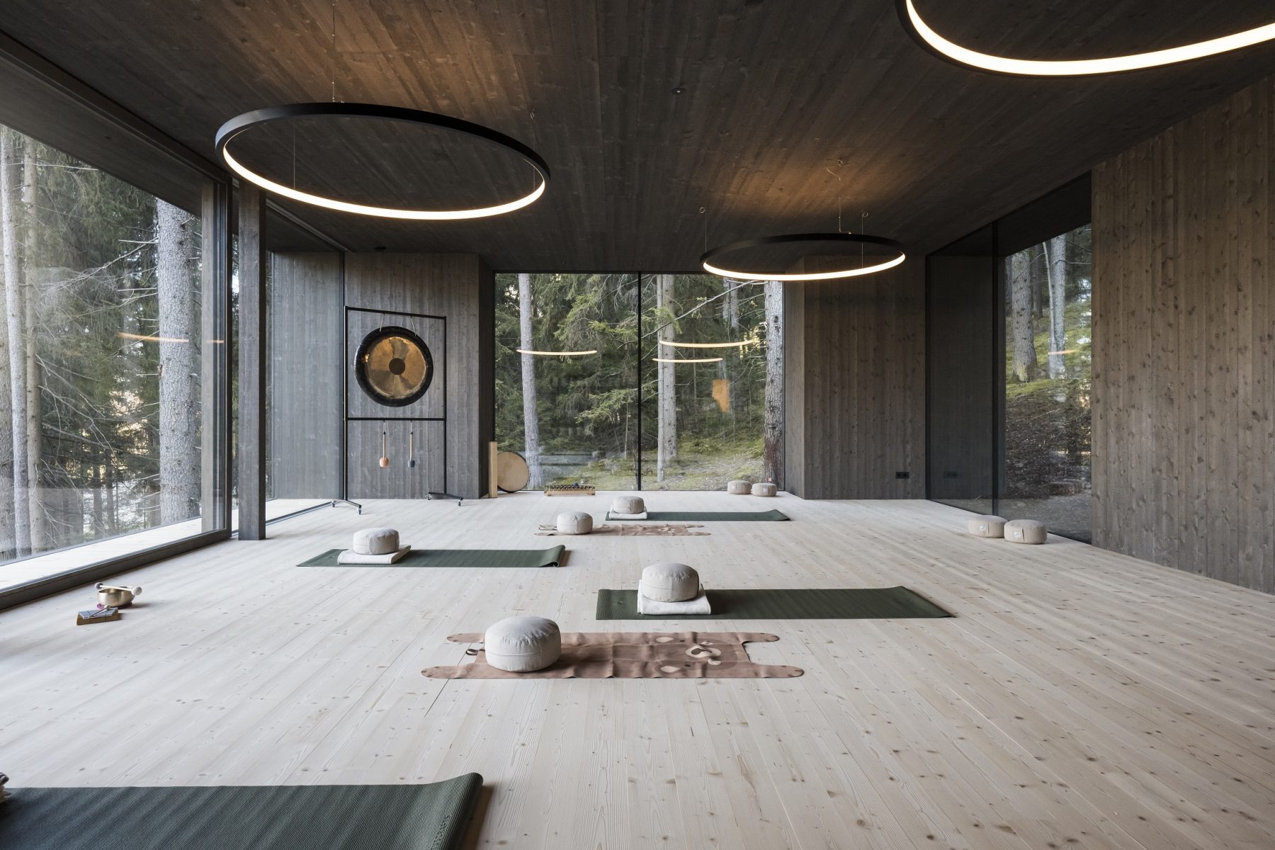 Infine un elemento di particolare pregio architettonico è l’Adults Only Spa, una struttura separata e sospesa tra gli alberi che ospita saune panoramiche e aree trattamenti. Questo volume appare come un rifugio segreto nella foresta, completando un progetto che fonde sapientemente materiali naturali di eccellente qualità, luci soffuse e geometrie rigorose. Il risultato è un rifugio d’avanguardia che svuota la mente dalla quotidianità per riempirla di una nuova connessione con l’ambiente montano.