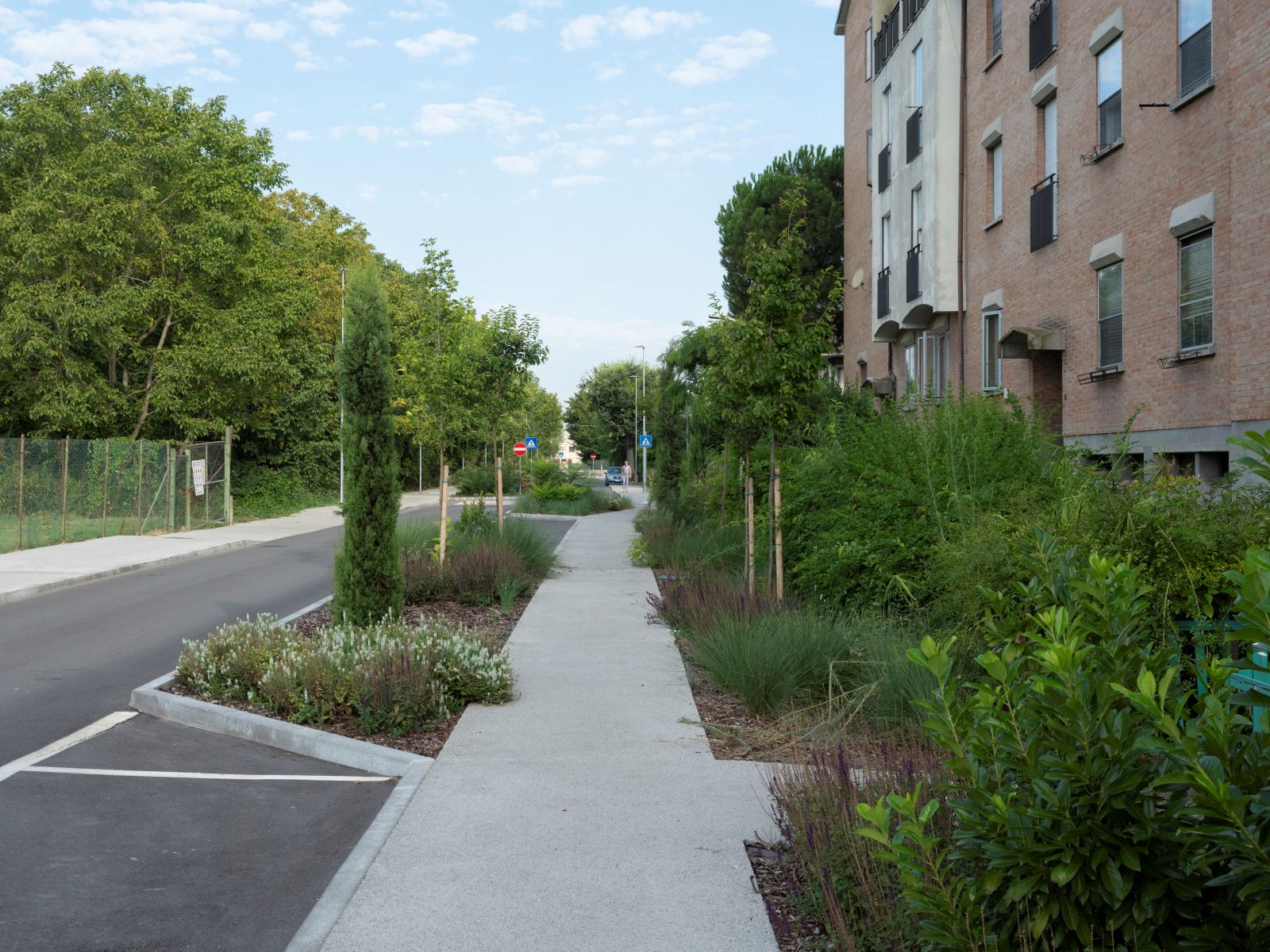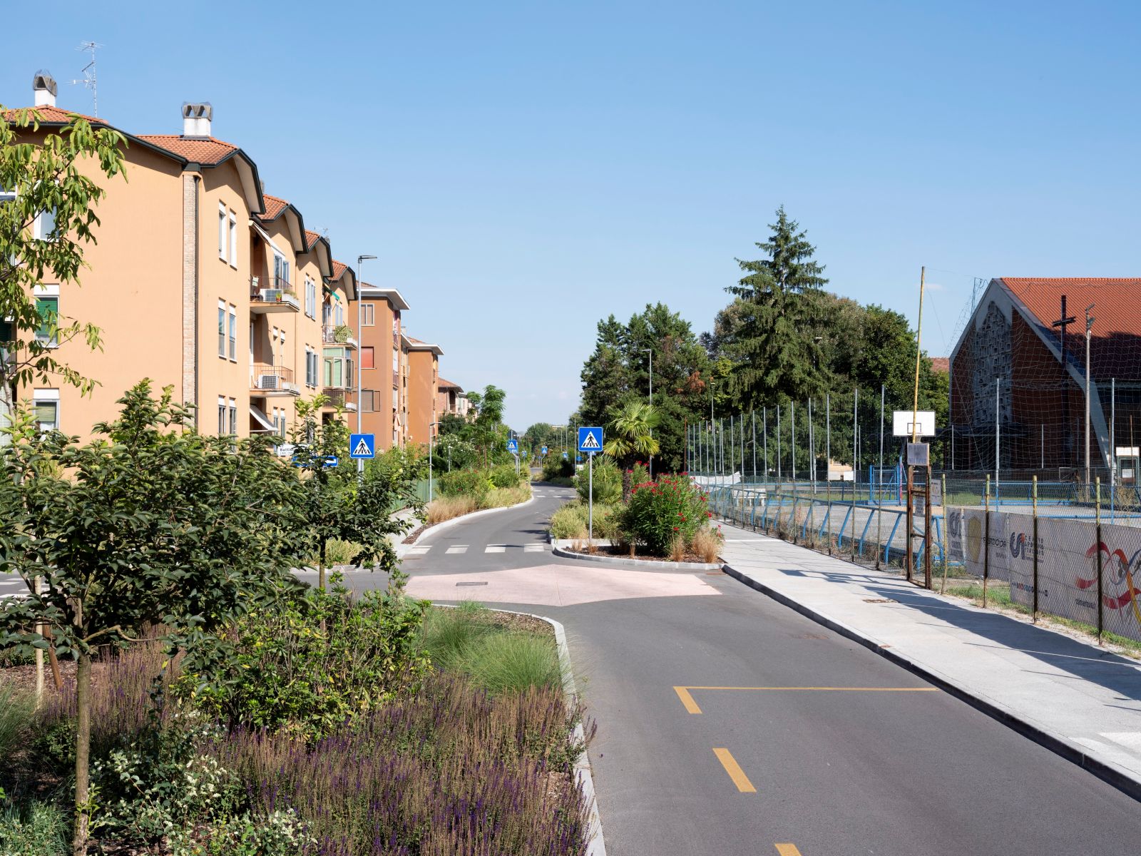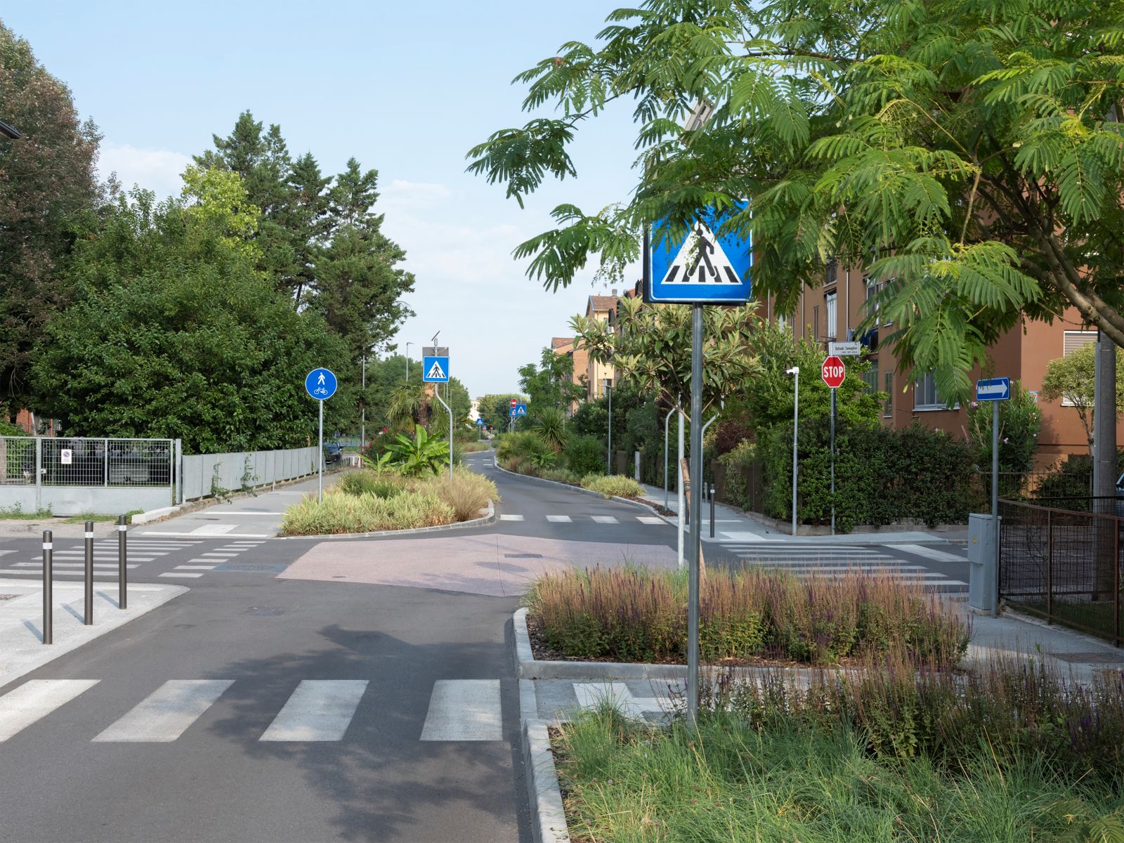 Via Amadei era, fin dagli anni Trenta, un rettilineo di 14 metri di larghezza, progressivamente soffocato dal traffico veloce che ne aveva compromesso la vivibilità. L’intervento ha scardinato questa linearità: attraverso una depavimentazione che ha ridotto le superfici asfaltate del 45%, la carreggiata è stata riconfigurata in un tracciato sinuoso e frammentato. Qui, il limite di velocità di 30 km/h non è un semplice obbligo cartellonistico, ma il risultato naturale di un design che alterna chicane, marciapiedi porosi e ampie aree verdi che rallentano il flusso veicolare in modo organico.