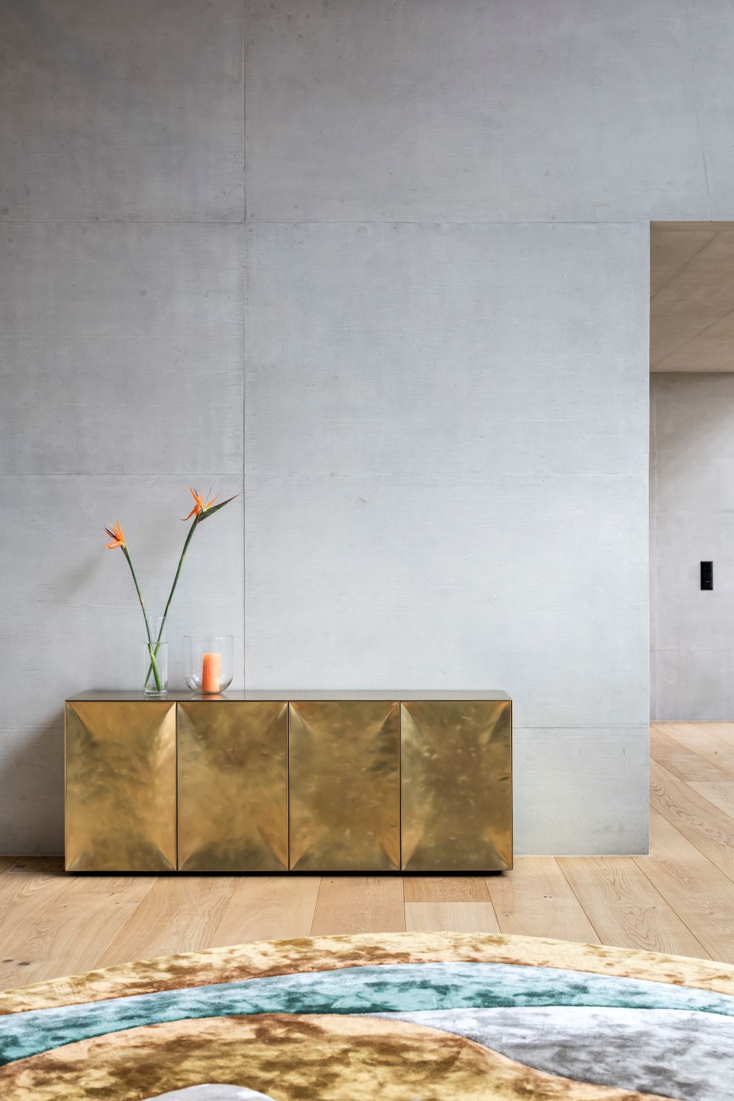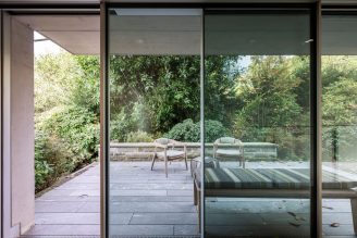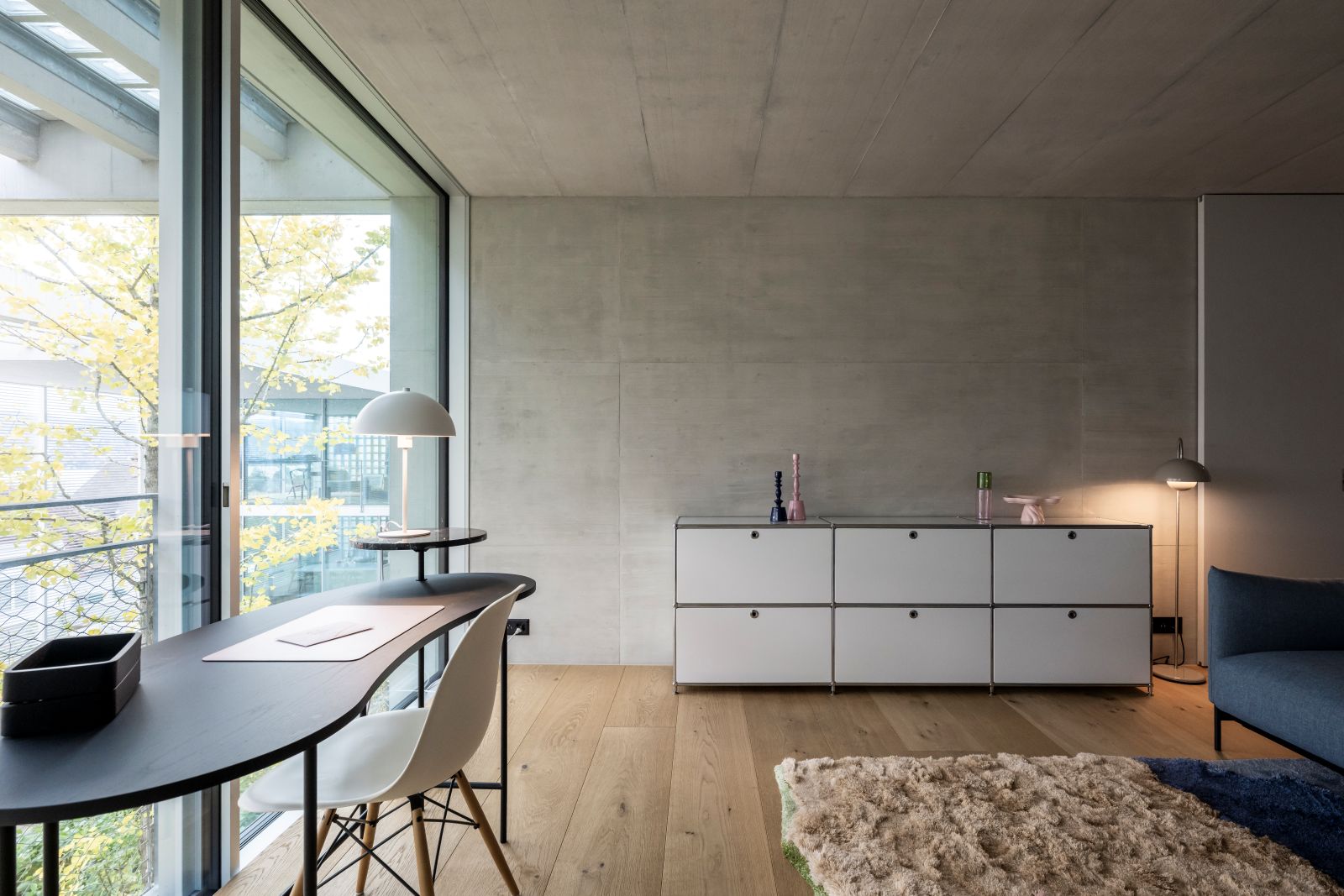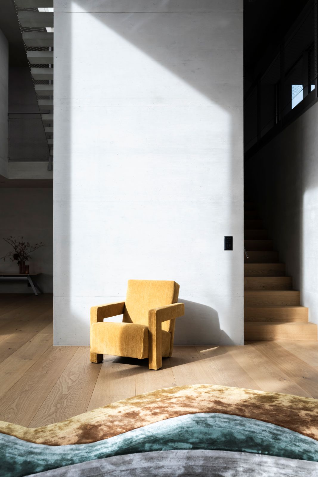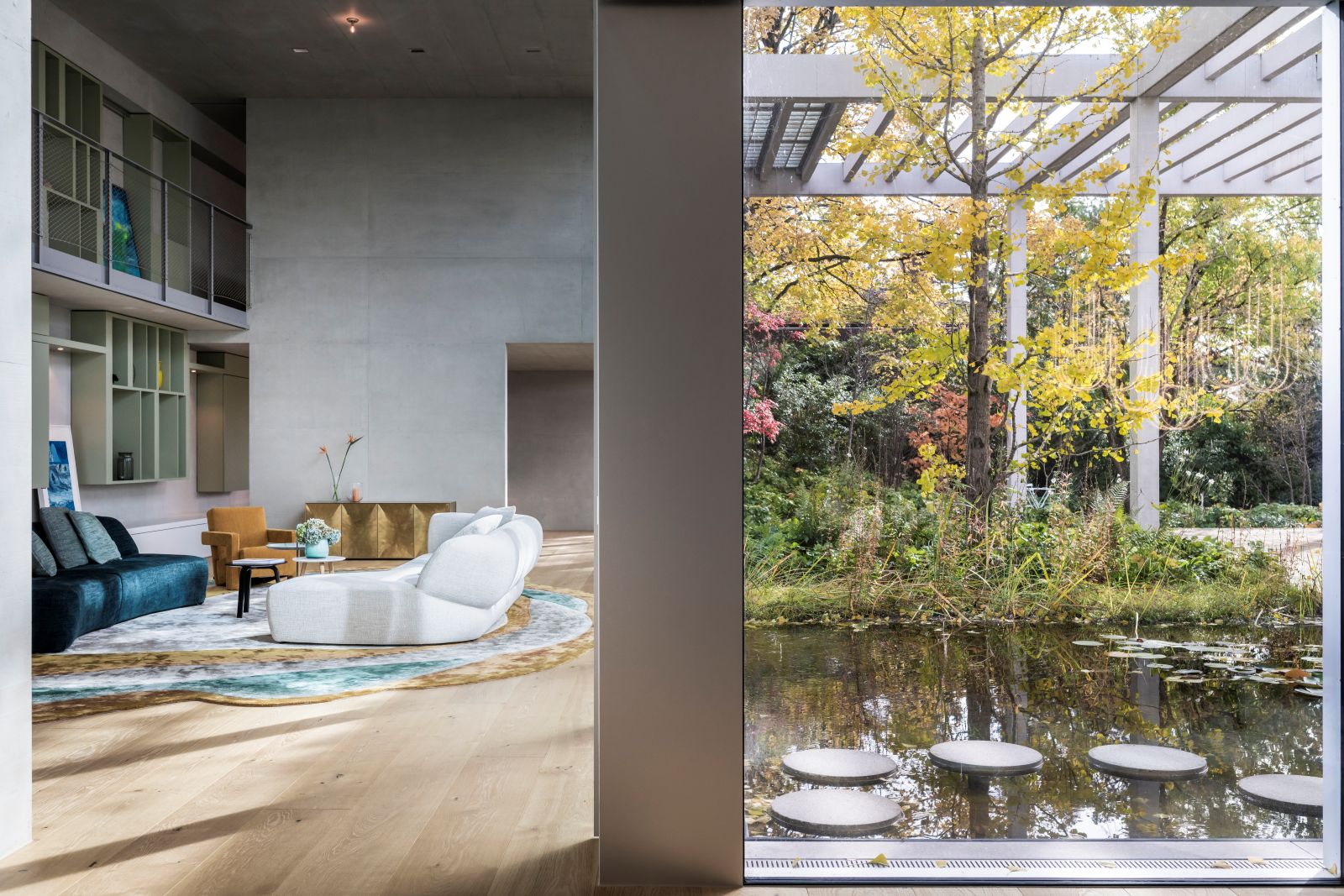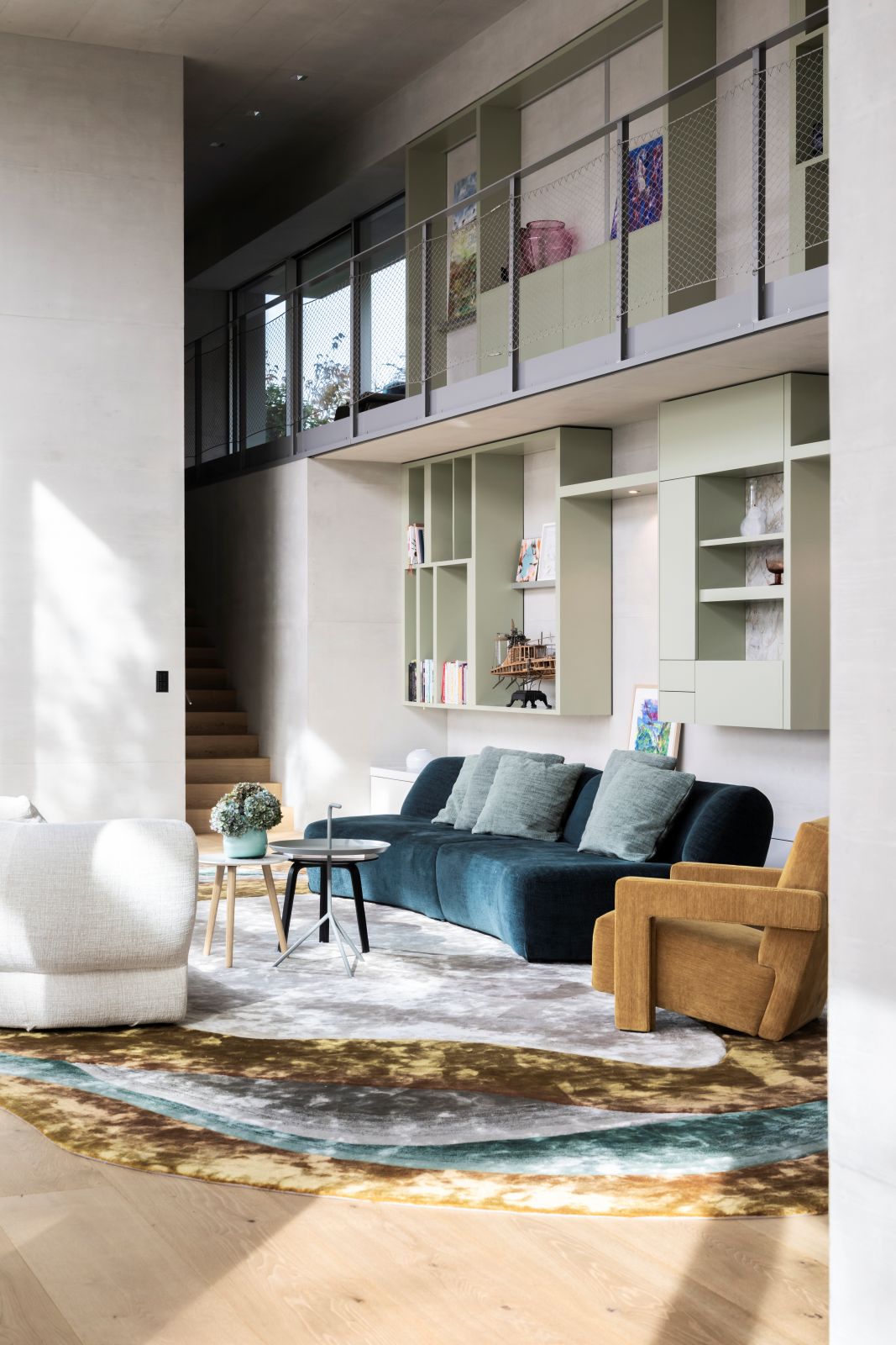 Il progetto si sviluppa su tre livelli, dove la materialità del cemento dialoga con il calore del parquet in rovere. Al piano terra, la convivialità è celebrata da un grande tavolo Van Rossum e sedute Ethnicraft, incorniciati da tappeti pregiati che migliorano il comfort acustico. La transizione tra interno ed esterno è quasi impercettibile grazie alle ampie vetrate e alle pareti in vetrocemento, che garantiscono privacy senza rinunciare alla luce naturale.