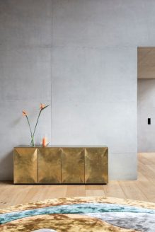 Il cuore pulsante della dimora è l’atrio monumentale a doppia altezza, caratterizzato da superfici in cemento a vista e un soffitto che supera i cinque metri. Qui, NOA ha operato una trasformazione emblematica: la preesistente parete libreria ha lasciato il posto a un elemento modulare contemporaneo color verde eucalipto, pensato per ospitare quadri e souvenir di viaggio. “Con questa tonalità facciamo riferimento al forte legame della villa con la natura, portando l’atmosfera esterna all’interno,” spiega l’interior designer Florian Marsoner.