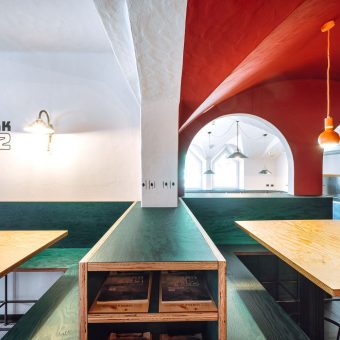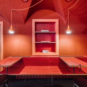 Fra la zona bar, vivace e dinamica, e la zona ristorante, più intima e riservata, si trova la sala che sintetizza il filo conduttore del progetto: l’esperienza del bivacco in prossimità della Croda dei Toni. A rappresentarla è una nicchia nella quale domina il rosso dalle pareti alle lampade mentre i tavoli pieghevoli richiamano quelli del bivacco, con tanto di moschettoni da arrampicata. In aggiunta, a ricordare il legame con la storia e la tradizione del territorio, rimane intatta la stube originale tirolese.