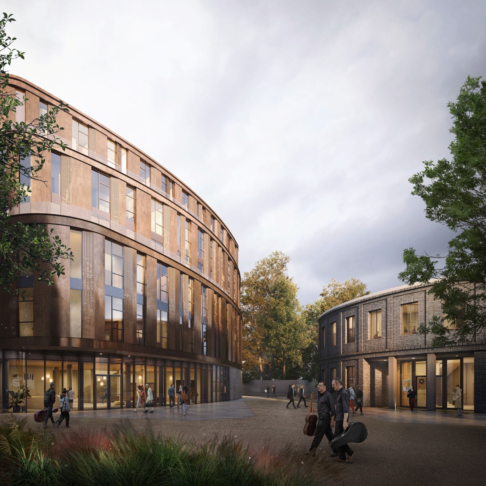 L’architettura del complesso, curata da Settanta7 in collaborazione con un team multidisciplinare, trae ispirazione dalle forme organiche del bosco. Il concept progettuale evoca l’immagine di quattro foglie cadute e mosse dal vento, che si traducono in volumi dai profili sinuosi e dinamici. Il campus si articolerà in quattro edifici principali: un Auditorium da 400 posti caratterizzato da scandole ceramiche in sette cromie; una residenza universitaria da 200 posti letto; la rifunzionalizzata palazzina “Ex Chimici” per le scuole di rock e jazz; e uno spazio polifunzionale per la musica elettronica con annessi bar e ristorante.