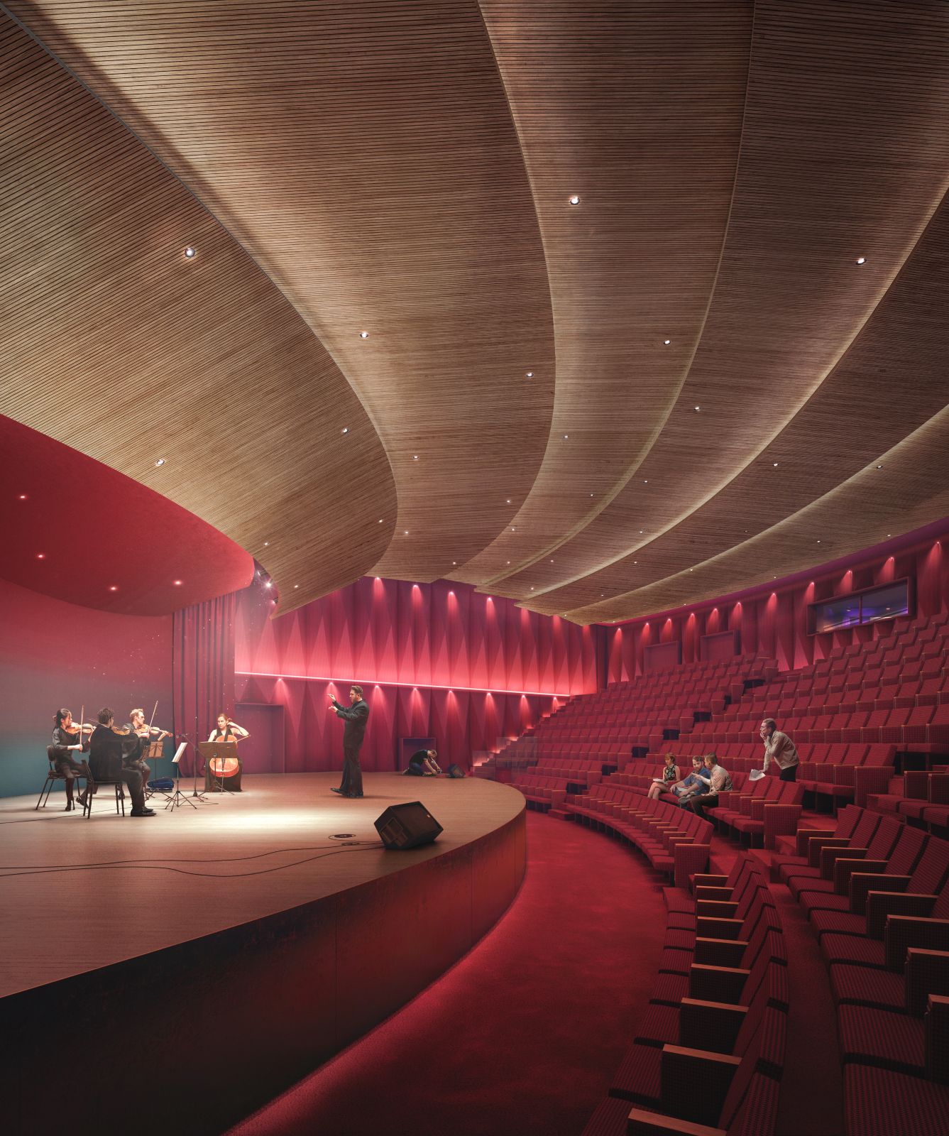 Grande attenzione è stata rivolta alla sostenibilità e all’innovazione tecnologica. Il complesso sarà uno smart building in grado di ottimizzare i consumi energetici in tempo reale. Per garantire il necessario isolamento acustico, gli impianti di climatizzazione sono stati progettati per essere silenziosi e non invasivi, utilizzando ventilconvettori insonorizzati e sistemi radianti. All’esterno, il progetto prevede un’arena estiva per concerti all’aperto, tetti verdi e prati fioriti pensati per favorire la biodiversità, integrando perfettamente la musica nel paesaggio urbano.
