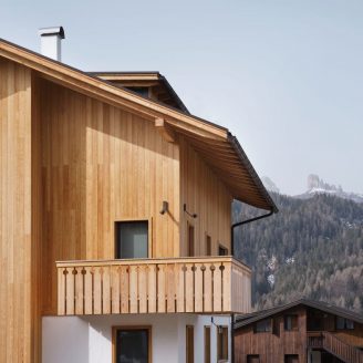 I materiali scelti si rifanno a quelli tipici delle residenze rurali alpine tipiche di questo contesto dolomitico. Al piano terra e al primo, infatti, si trovano dei rivestimenti con un guscio composto da calce stesa in andamento, mentre la fascia superiore della casa è rivestita con legno di larice lasciato al naturale, in modo che nel tempo depositi la sua patina e si trasformi integrandosi con il contesto circostante.