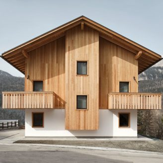 Con una vista impareggiabile sulle cime dolomitiche, l’attuale villa ha una superficie calpestabile di circa 250 mq. Per realizzarla è stato demolito l’edificio preesistente e si è edificata una nuova costruzione di tre piani in legno. Struttura e solai sono stati realizzati con tecnologia X-Lam e l’uso di pannelli di 10 cm placcati esternamente con cappotto e con rifodera interna in cartongesso per il passaggio dell’impiantistica. Attraverso un’operazione di sottrazione volumetrica è stato possibile inserire un ascensore che collega verticalmente tutti i piani.