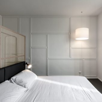 I cinque piani superiori, collegati dalla nuova scala in lamiera con un corrimano in legno massello e da un ascensore, sono dedicati esclusivamente alle camere riuscendo a ospitare sette camere doppie e due singole per piano. Le 57 camere sono caratterizzate da una raffinata color palette di blu petrolio, ocra profondo o salvia antico, usata anche per alcuni degli elementi d’arredo abbinati ad elementi architettonici neutri come la boiserie ton su ton, presente in tutte le camere, e gli elementi in legno sui toni della terra.
