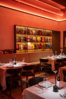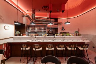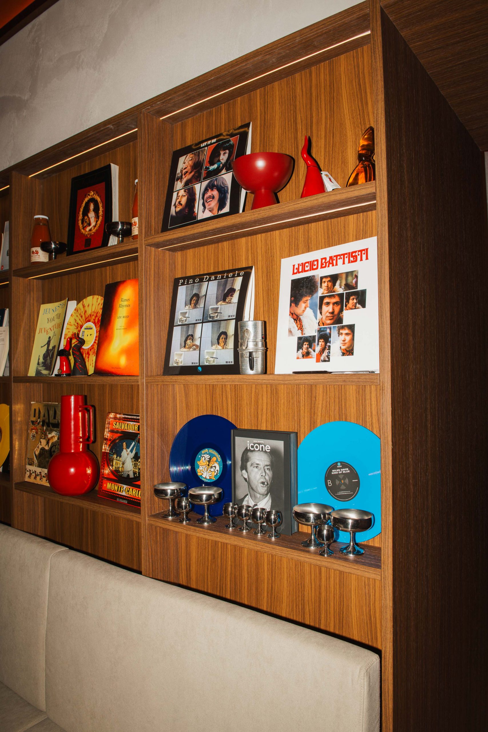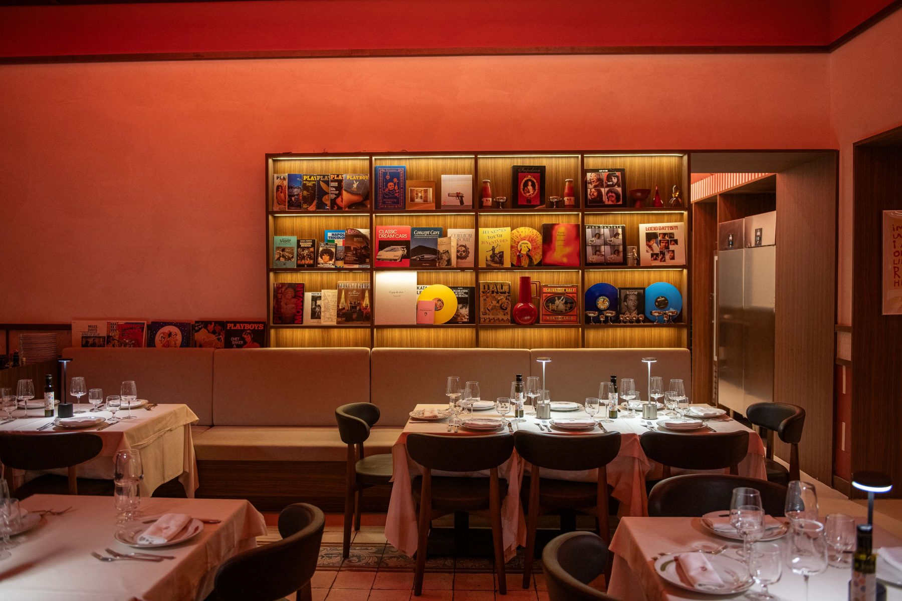 L’uso del legno massello di noce nazionale per portali e rivestimenti su disegno dell’architetto crea quinte sceniche calde, capaci di esaltare un’illuminazione morbida e profonda. La palette cromatica, dominata da un rosso mattone che funge da cifra identitaria, accompagna il visitatore dal giardino esterno attraverso le quattro sale interne. In questo percorso, la zona brace si distingue come uno spazio scenografico dove la tecnologia Josper e un’affettatrice Berkel d’epoca vengono elevate a elementi architettonici, trasformando la cucina in una vera performance visiva.