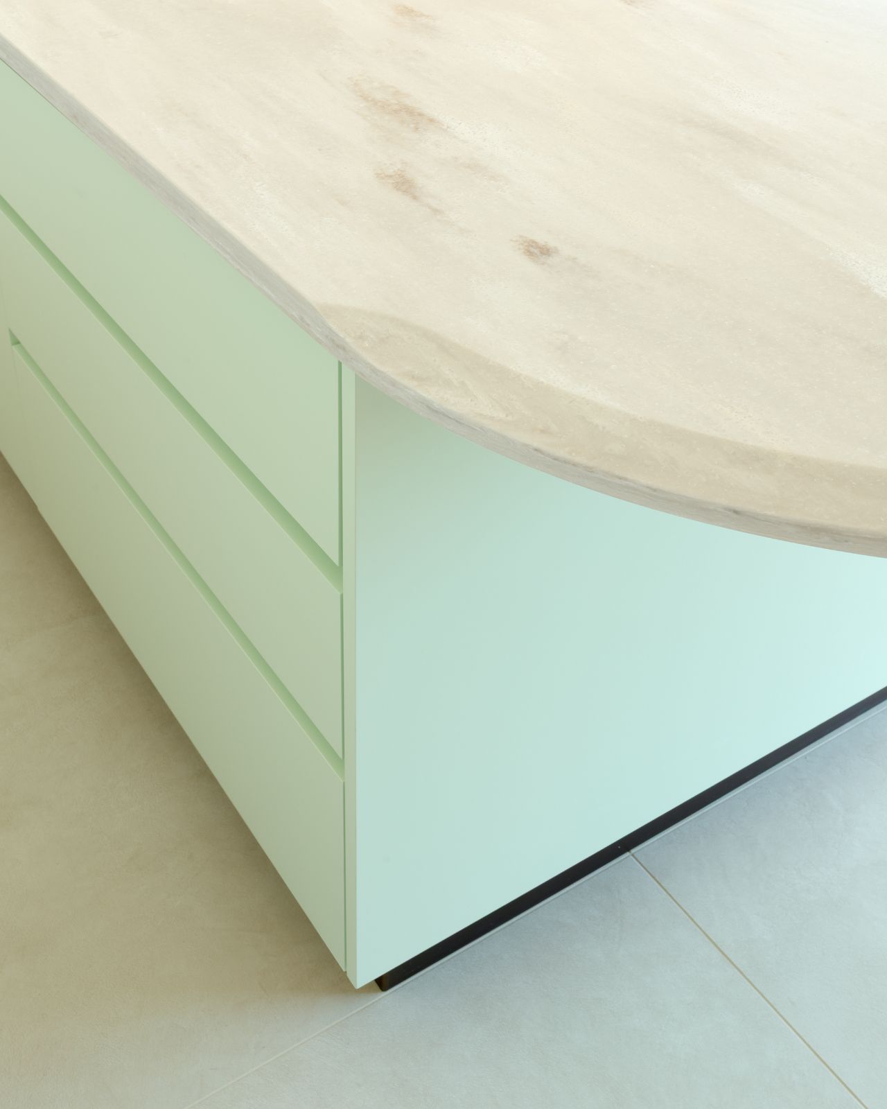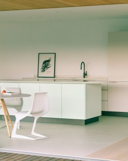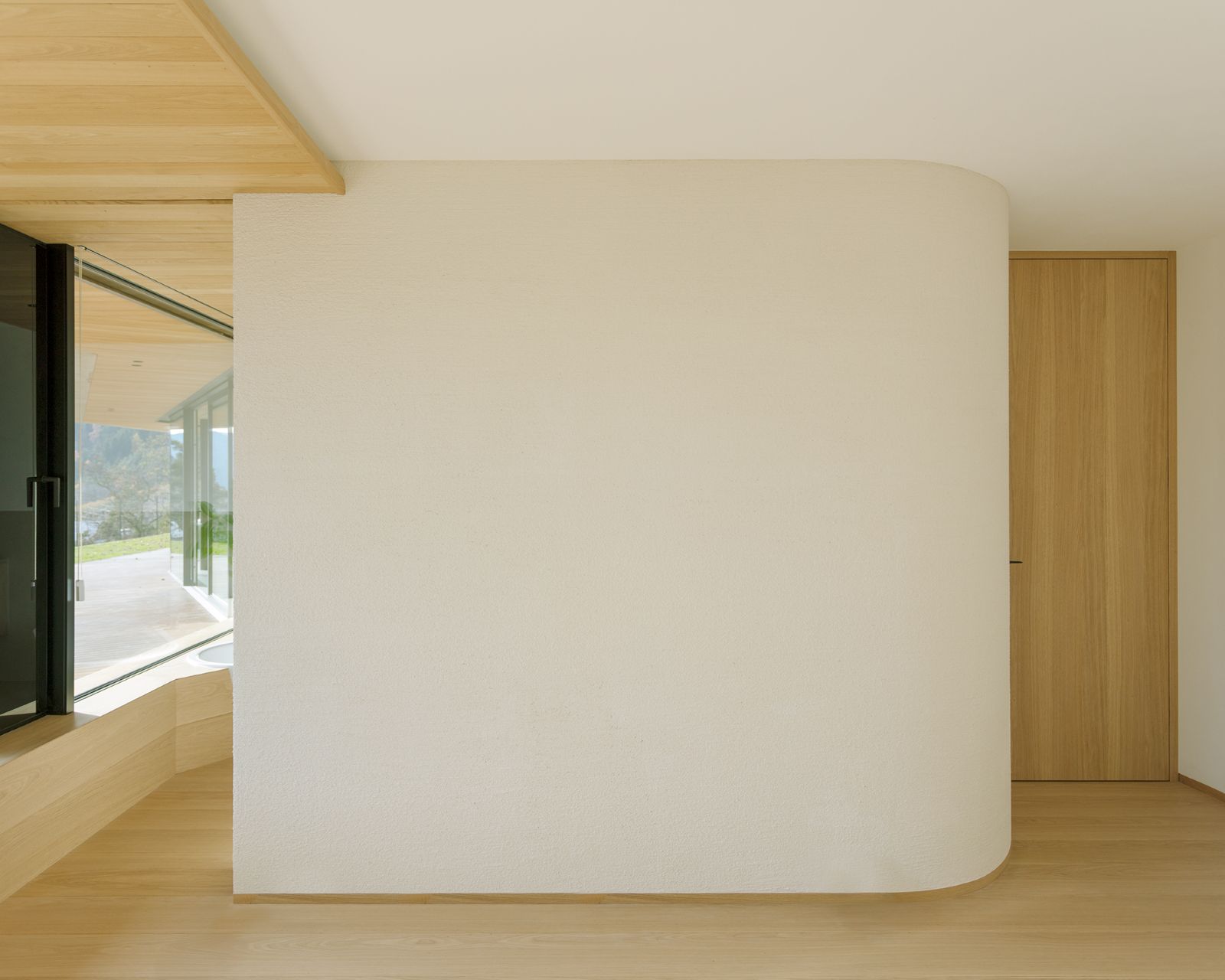 L’architettura risponde con precisione all’orientamento solare: una copertura a sbalzo protegge gli interni e la terrazza dal surriscaldamento estivo, mentre le vetrate a tutta altezza annullano il confine tra spazio interno ed esterno. Esternamente, l’edificio è definito da cemento a vista, muratura in pietra naturale e ampie superfici vetrate. All’interno, il progetto punta sul contrasto materico: l’intonaco grezzo con aggregati locali e il calore del legno di castagno e quercia per pavimenti e arredi si contrappongono a superfici lisce e mobili dai toni monocromatici.