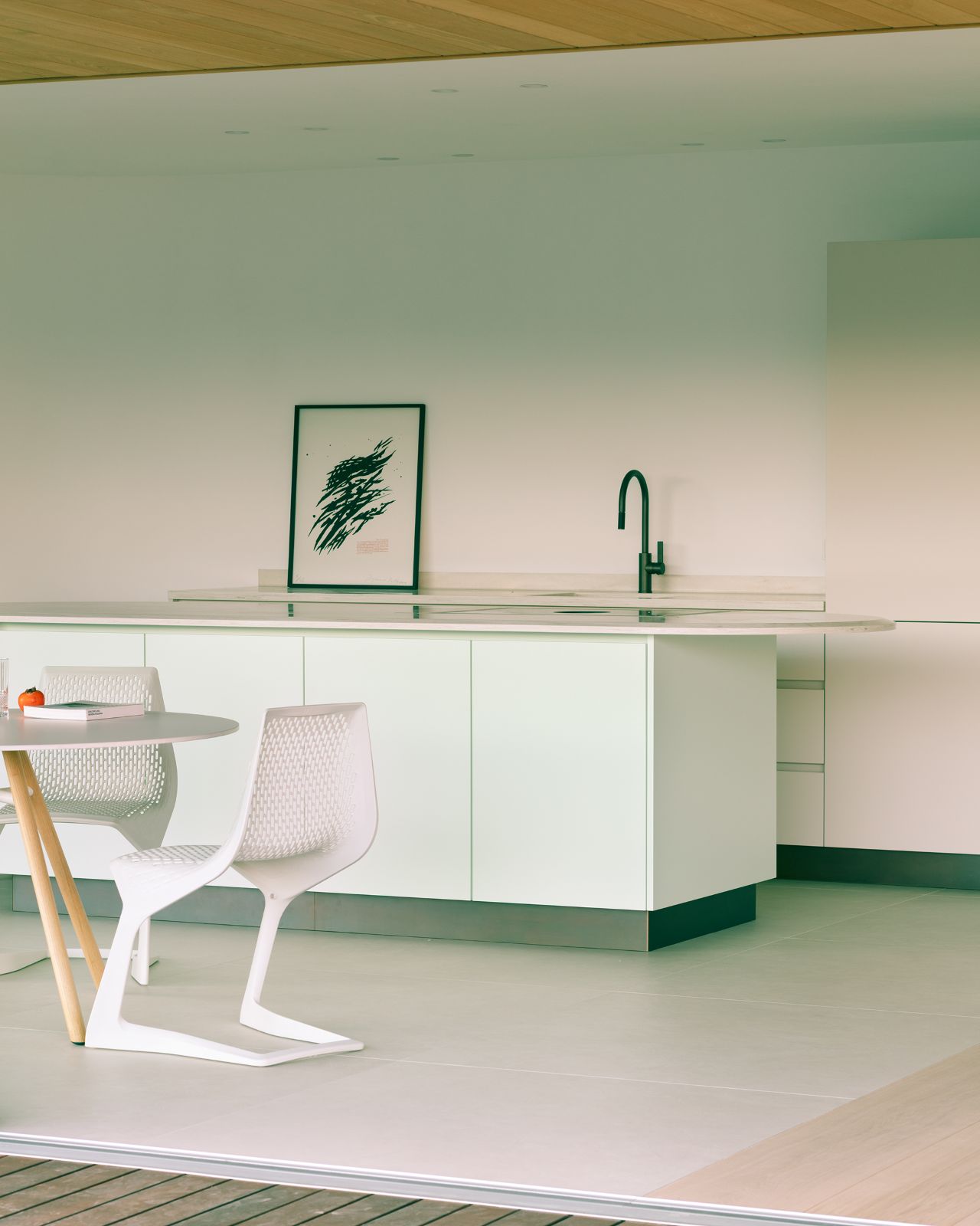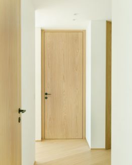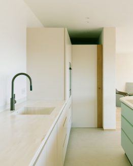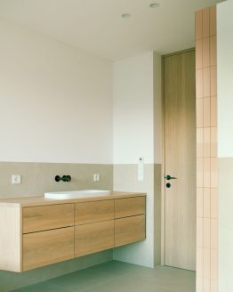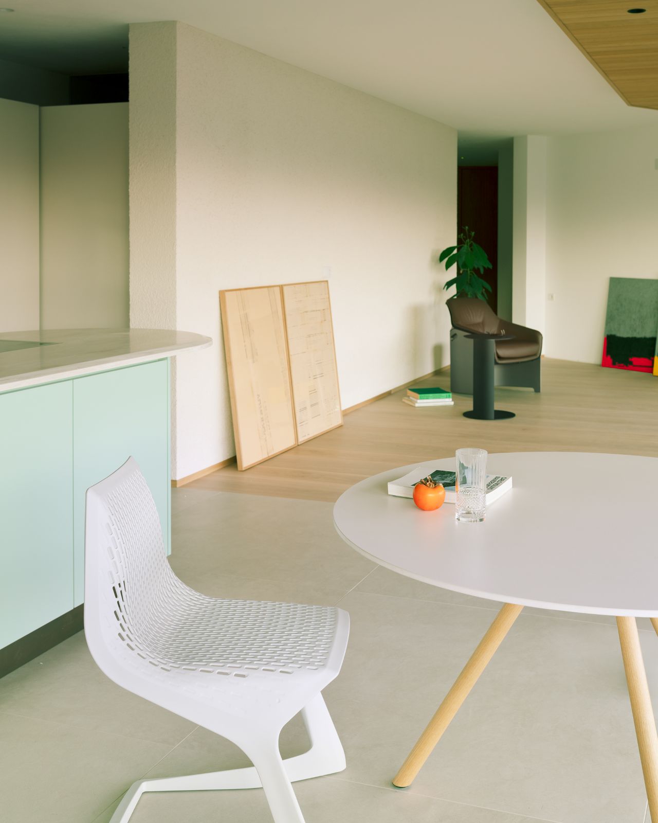 L’intervento si distingue per un’integrazione quasi impercettibile nella topografia del terreno, seguendo l’andamento del pendio in armonia con il contesto rurale caratterizzato da edifici sparsi. L’ampliamento, sviluppato su un unico piano, è collegato alla struttura principale tramite un passaggio sotterraneo non visibile dall’esterno. Questa configurazione, unita a un attento studio dei percorsi e dei livelli, assicura la massima privacy agli abitanti. La nuova unità abitativa si articola attorno a una zona giorno centrale con cucina integrata, affiancata lateralmente dalle camere da letto e dai bagni.