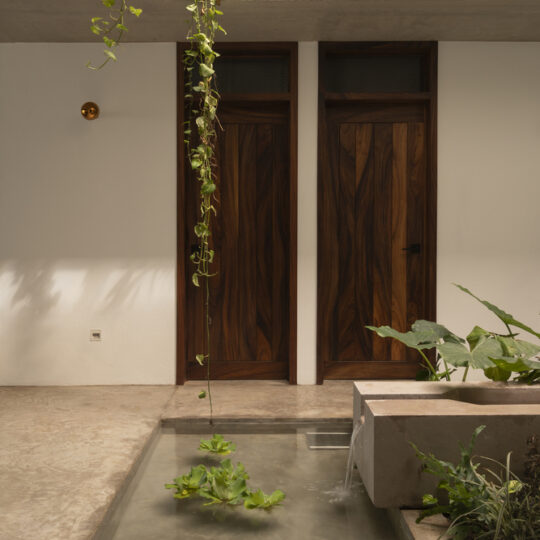 La vegetazione è infine la grande protagonista, presente in ogni angolo di Casa Mirlo: nel cortile centrale, una fioriera rialzata ospita una varietà di piante sospese che cadono verso la fontana di pietra e il suo specchio d’acqua, mentre nei cortili delle camere da letto, l’uso delle piante permette una maggiore privacy in corrispondenza dei diversi bagni della casa, riorganizzati per sfruttare al meglio lo spazio disponibile.