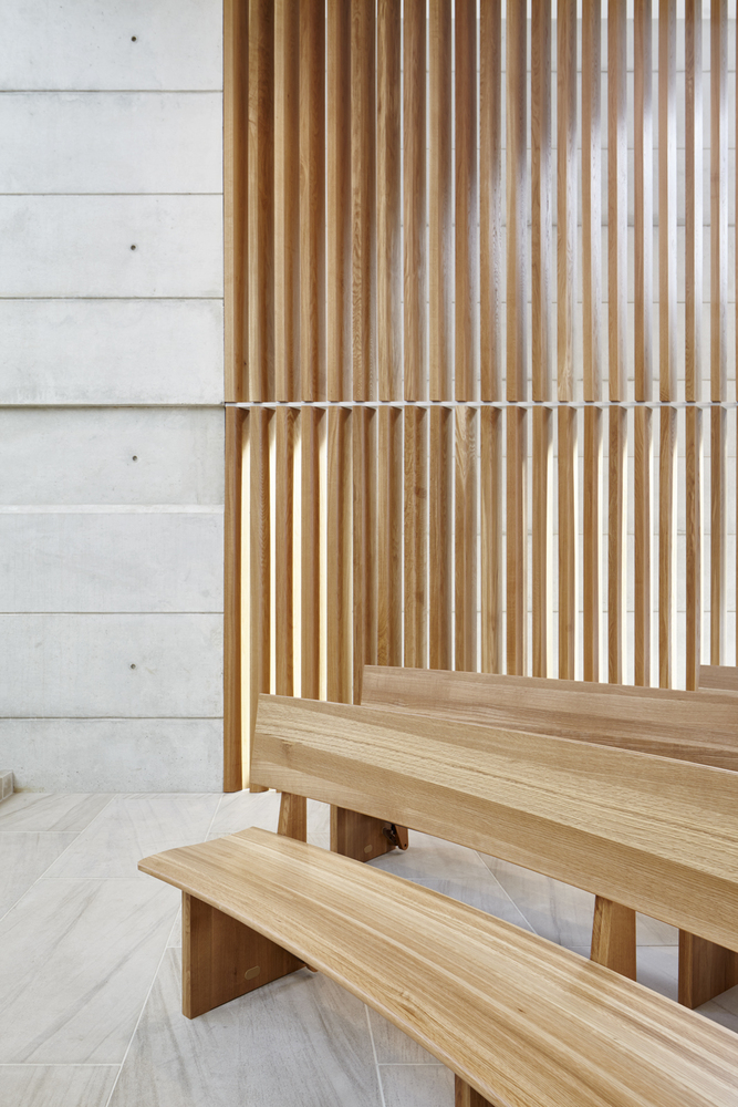 Silenzio e luce valorizzano le vetrate e i materiali selezionati, tra cui la pietra calcarea dell’Alabama e il legno di quercia bianca americana; si accede alla cappella attraverso il retro e lo sguardo del visitatore viene direzionato attraverso una parete di vetrate e definito da un grande schermo di legno.