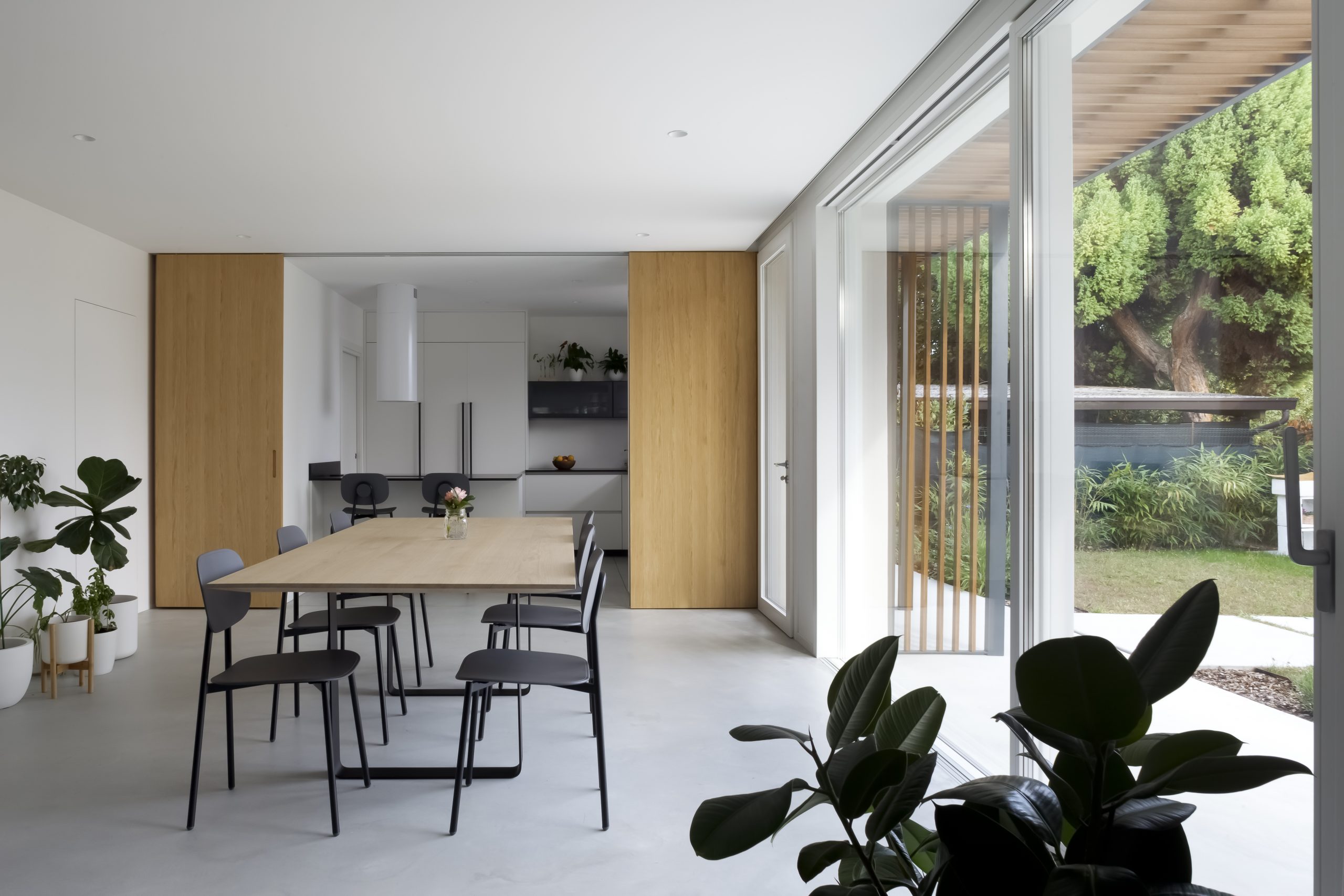 Fondamentale per la flessibilità d’uso è la grande parete scorrevole a tutta altezza, realizzata in rovere e posizionata strategicamente tra l’area cucina e quella pranzo. Essa consente di modulare l’ambiente: se aperta, dilata la percezione di continuità degli spazi; se chiusa, garantisce intimità e un elevato ordine formale. Questa permeabilità visiva e funzionale è ulteriormente accentuata dalle grandi vetrate a tutt’altezza che dominano la sala da pranzo. Esse aprono la prospettiva direttamente sul verde esterno, generando un continuum spaziale che trasforma di fatto il giardino in una naturale estensione dell’abitazione.