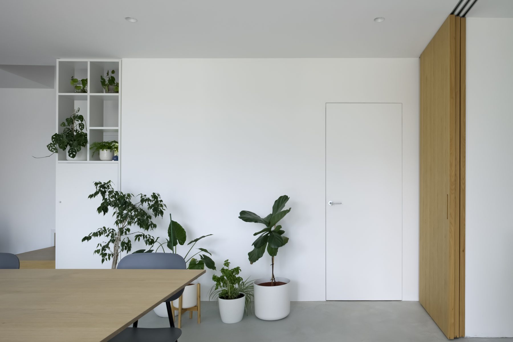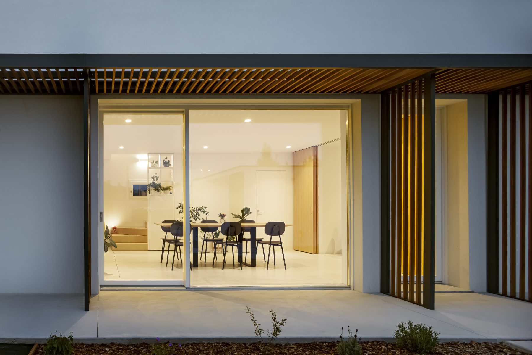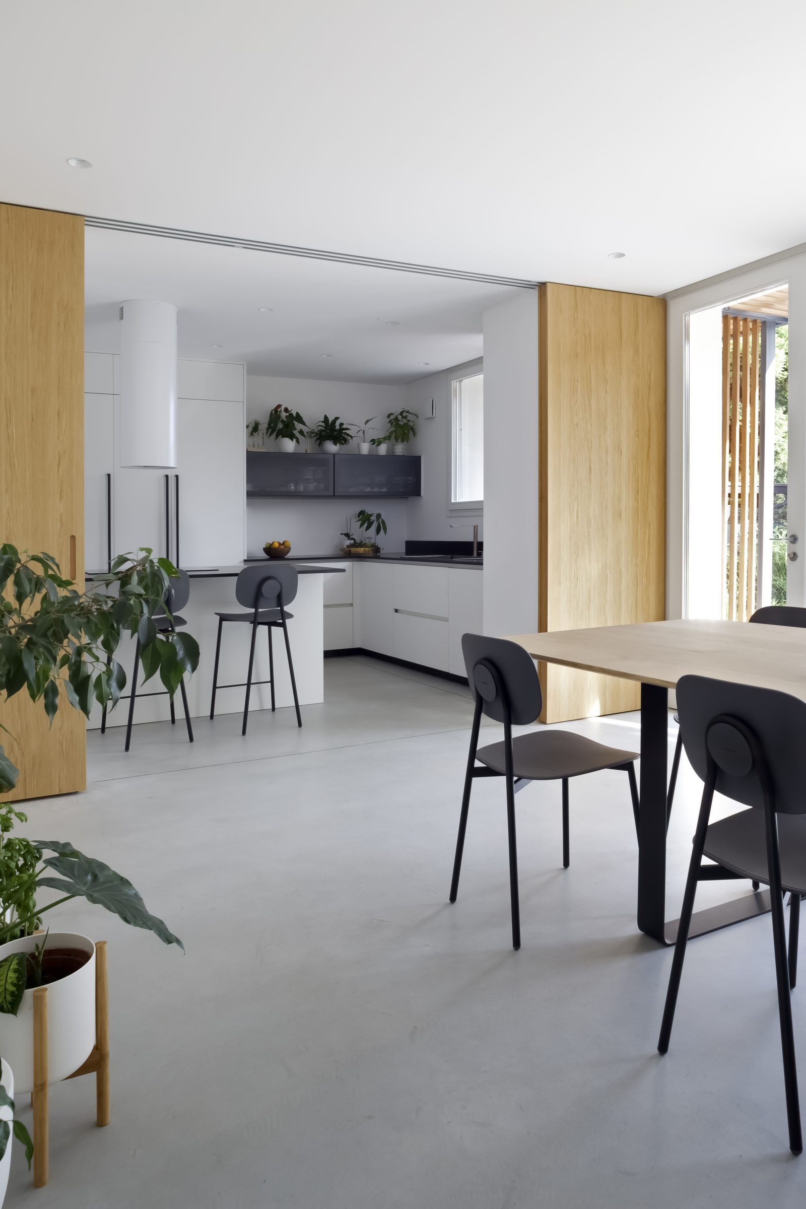 Fondamentale per la flessibilità d’uso è la grande parete scorrevole a tutta altezza, realizzata in rovere e posizionata strategicamente tra l’area cucina e quella pranzo. Essa consente di modulare l’ambiente: se aperta, dilata la percezione di continuità degli spazi; se chiusa, garantisce intimità e un elevato ordine formale. Questa permeabilità visiva e funzionale è ulteriormente accentuata dalle grandi vetrate a tutt’altezza che dominano la sala da pranzo. Esse aprono la prospettiva direttamente sul verde esterno, generando un continuum spaziale che trasforma di fatto il giardino in una naturale estensione dell’abitazione.