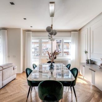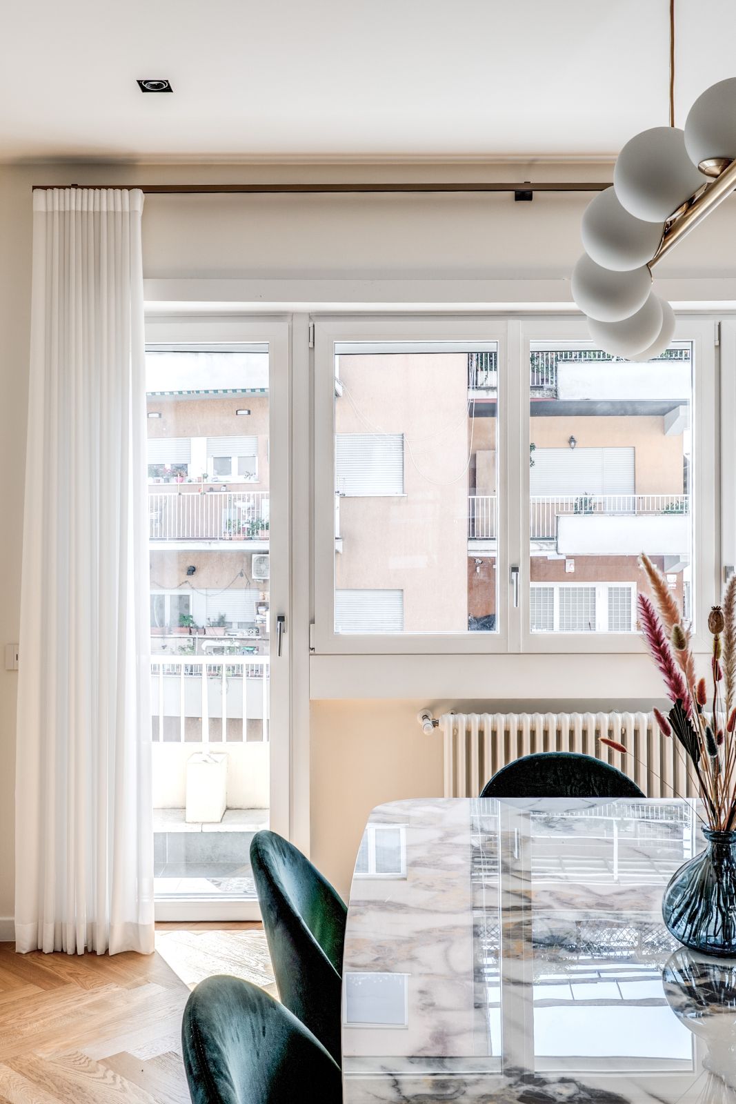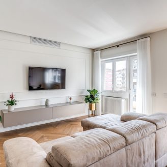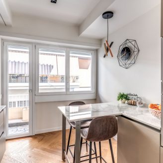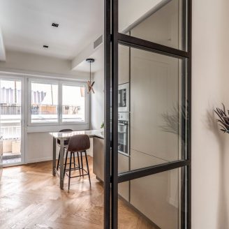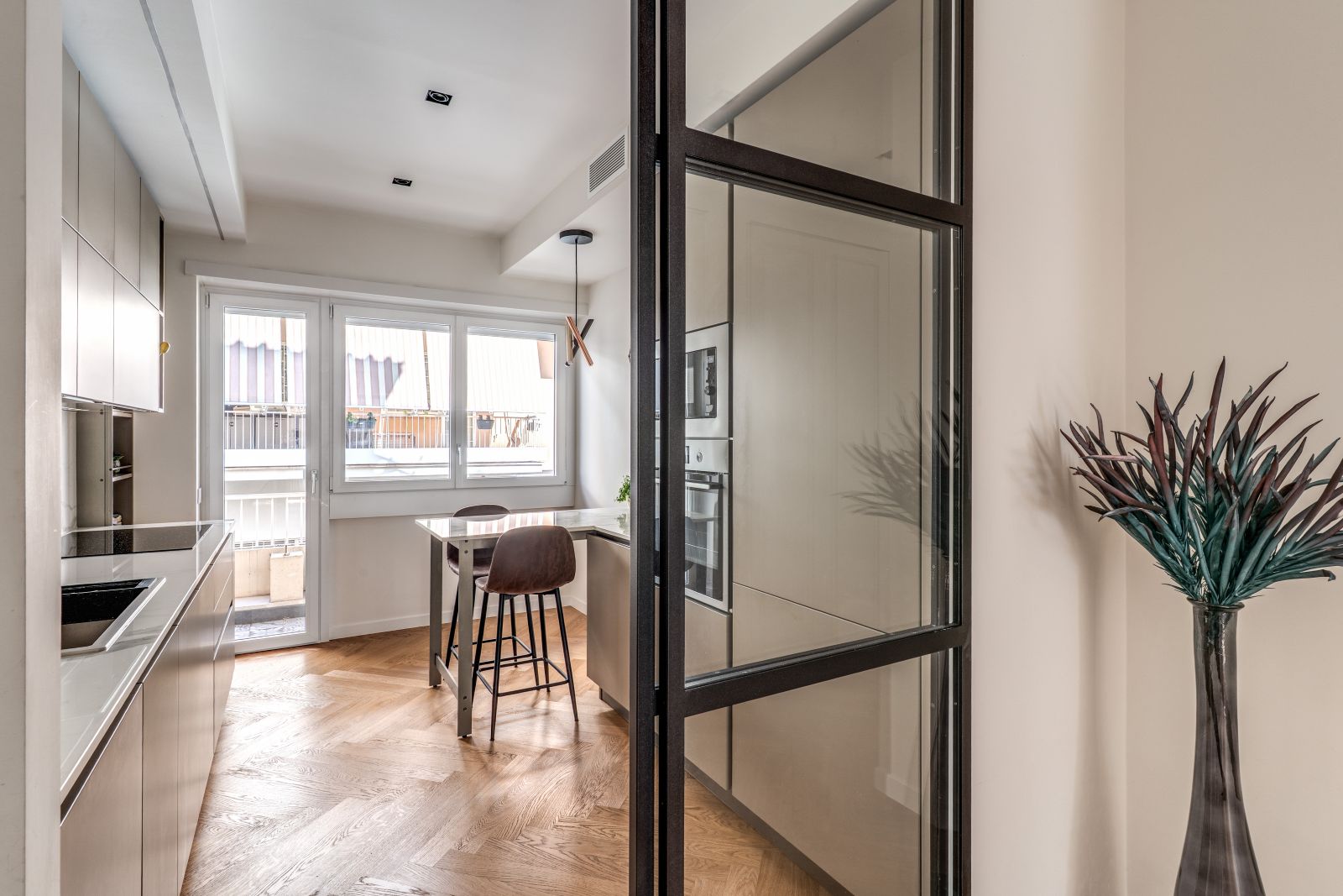 La cura del dettaglio si estende alla personalizzazione degli infissi, che si adattano cromaticamente agli arredi di design scelti per l’appartamento, tra cui spiccano la cucina Veneta Cucine, il lampadario Riflessi e i complementi selezionati presso lo showroom Frattali.