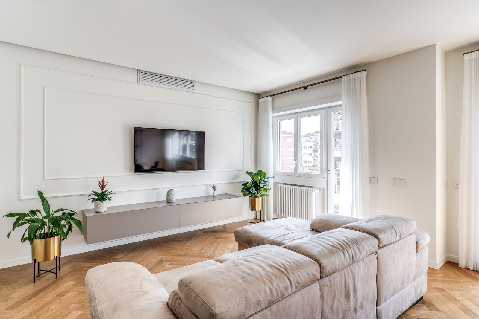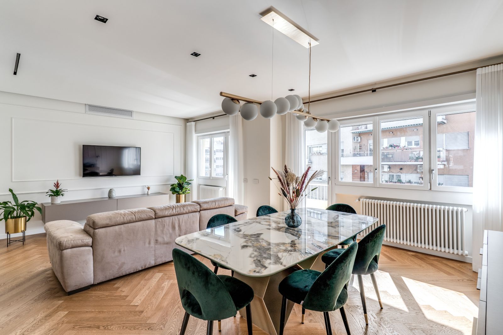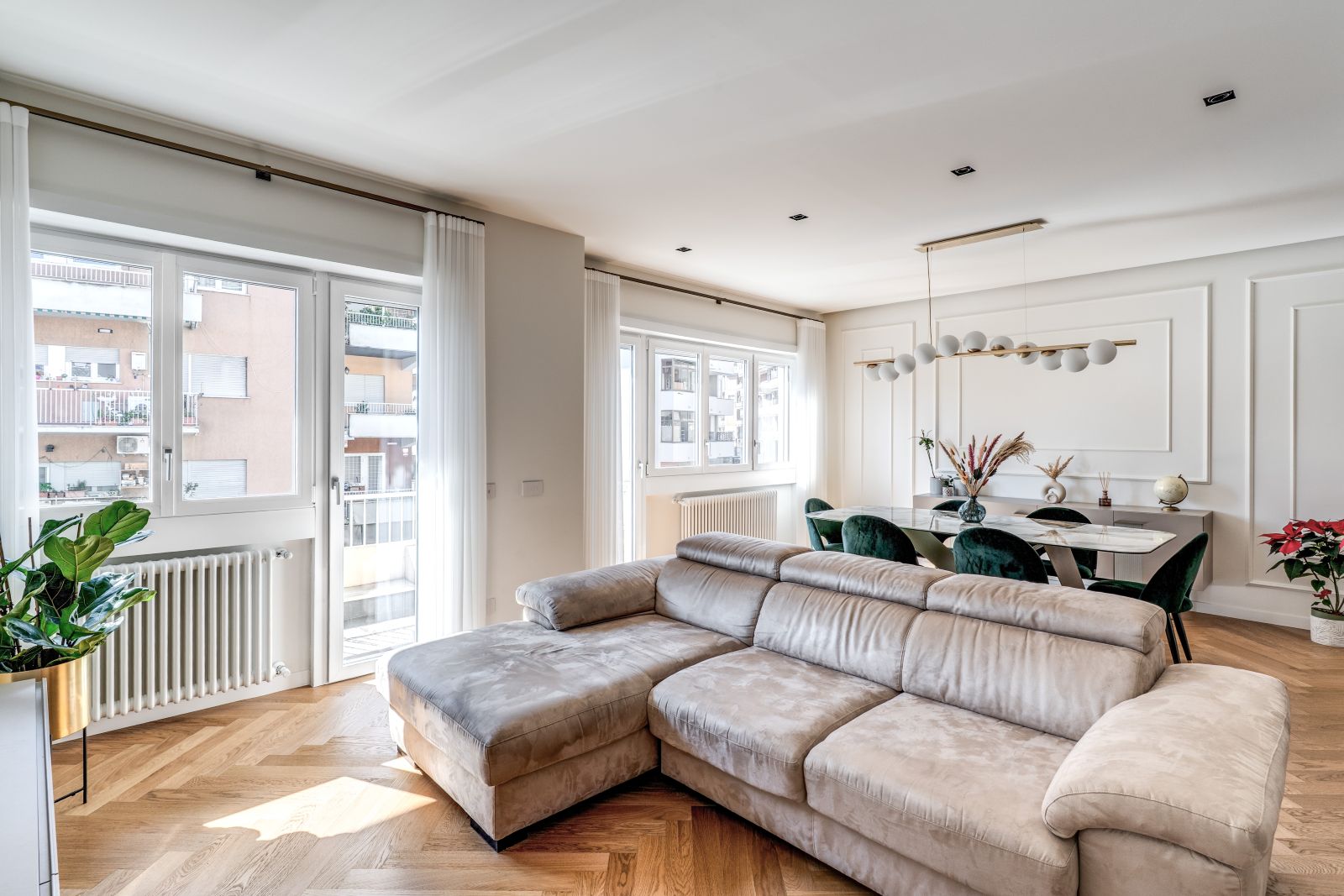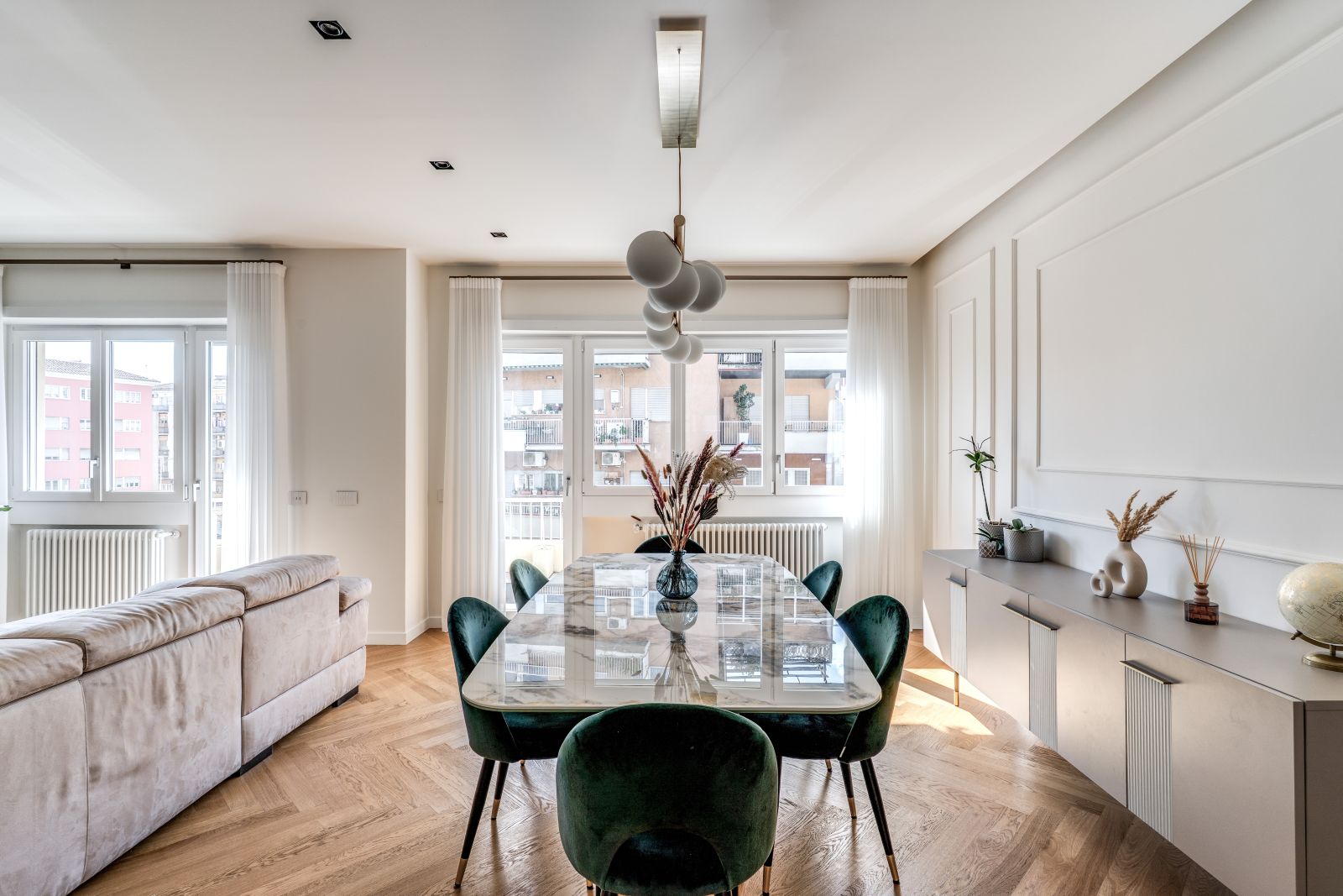 Il fulcro della dimora è una zona giorno vasta e accogliente, pensata per massimizzare la percezione dello spazio e la continuità tra i diversi ambienti domestici. Il risultato è una cucina che dialoga armoniosamente con il living grazie a una moderna vetrata, mentre il parquet a spina italiana si distende in tutta l’abitazione, fungendo da tappeto materico di pregio che collega il soggiorno alle due camere singole, ai due bagni e alla suite matrimoniale.