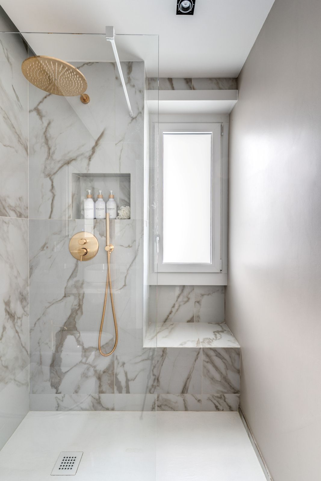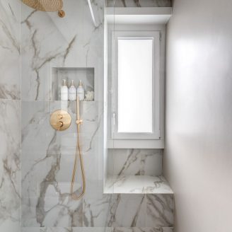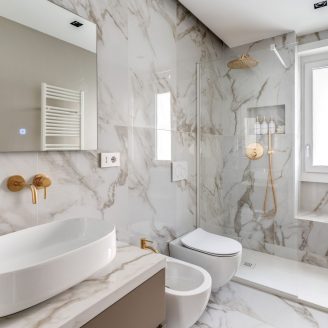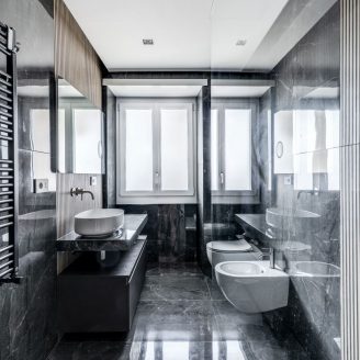 L’architettura dell’appartamento gioca su una palette cromatica raffinata, dominata dai toni caldi del tortora che si alternano ai marmi chiari e scuri dei servizi, definendo un’atmosfera di charme discreto ma ricercato. In questo scenario, la luce naturale non è un semplice elemento accessorio, ma un vero e proprio materiale costruttivo che l’architetto Cioccetti ha saputo plasmare con estrema attenzione.