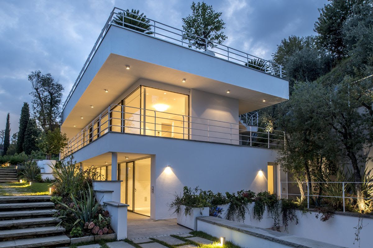 Un caso di perfetta combinazione tra illuminazione e progetto architettonico è quello di una villa con piscina situata nell’affascinate scenario naturale del basso lago di Garda: caratterizzata da volumi squadrati e geometrici, la villa si estende verticalmente su tre piani, di cui l’ultimo terrazzato, che si prestano a esclusivi giochi di luce e ombre capaci di esaltare le forme rigorose del cemento bianco puro, senza tralasciare le esigenze abitative e il comfort, assicurato proprio dal progetto illuminotecnico che unisce esigenze tanto decorative quanto funzionali grazie ai prodotti di Francesconi Architectural Light
