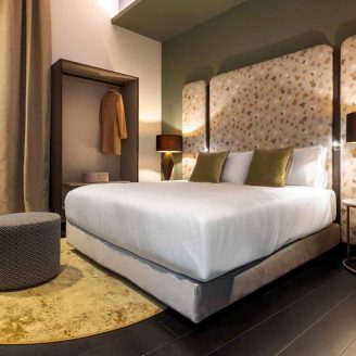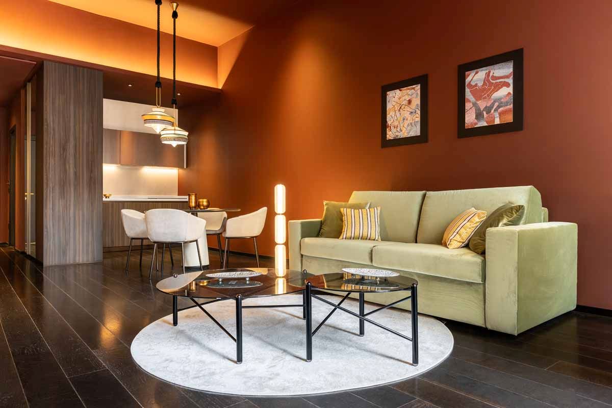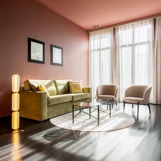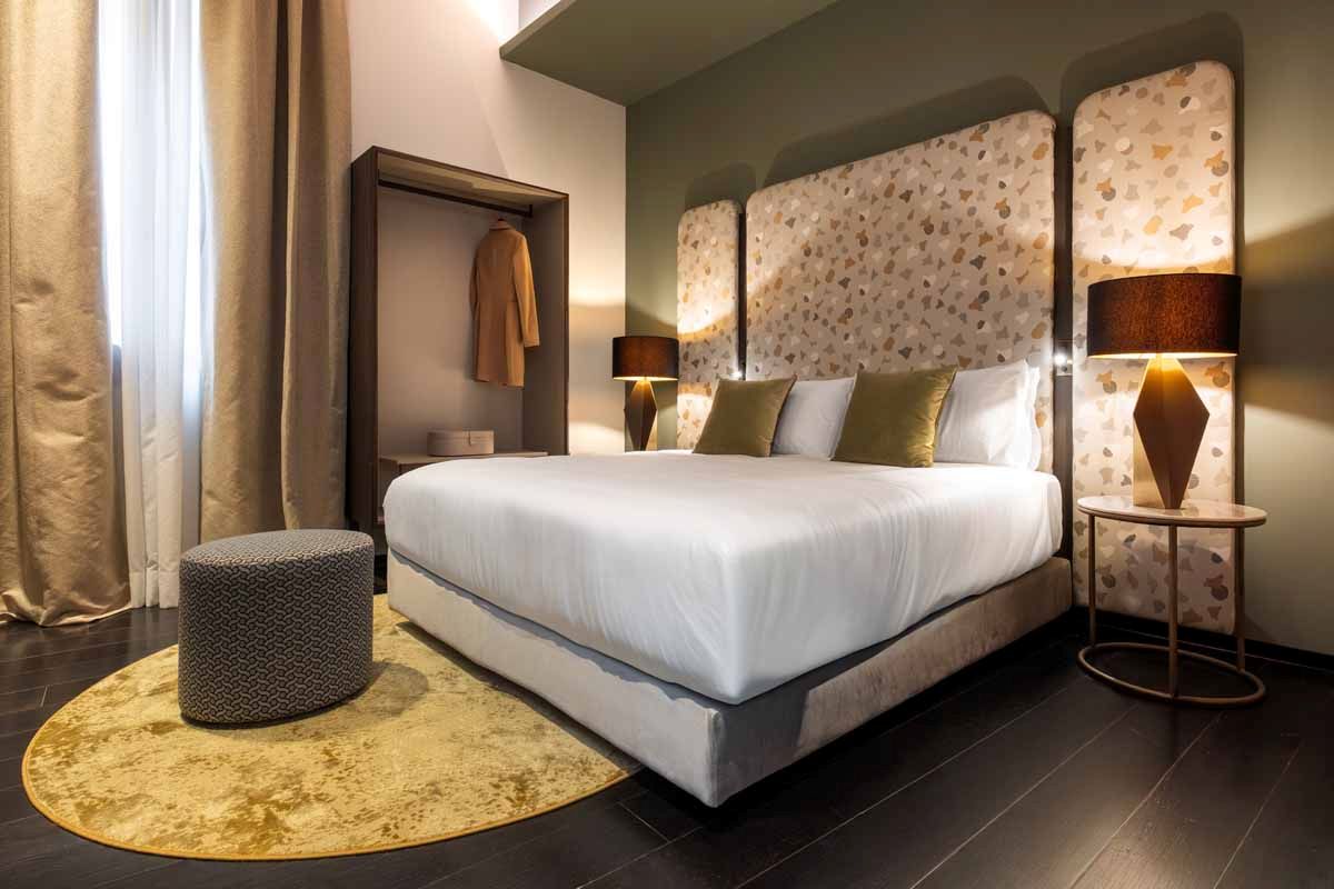 Un omaggio alla tradizione tessile della città è dato dai tessuti e dalle carte da parati della storica azienda veneziana Rubelli, alcune delle quali rielaborano motivi seicenteschi in chiave moderna. Il colore è un elemento fondamentale, caratterizza ogni ambiente con tonalità uniche che si estendono fino ai soffitti, creando spazi immersivi e avvolgenti. Gli arredi sono stati concepiti come elementi self-standing, posizionati in modo discreto per integrarsi negli spazi nel pieno rispetto della naturale conformazione della struttura.