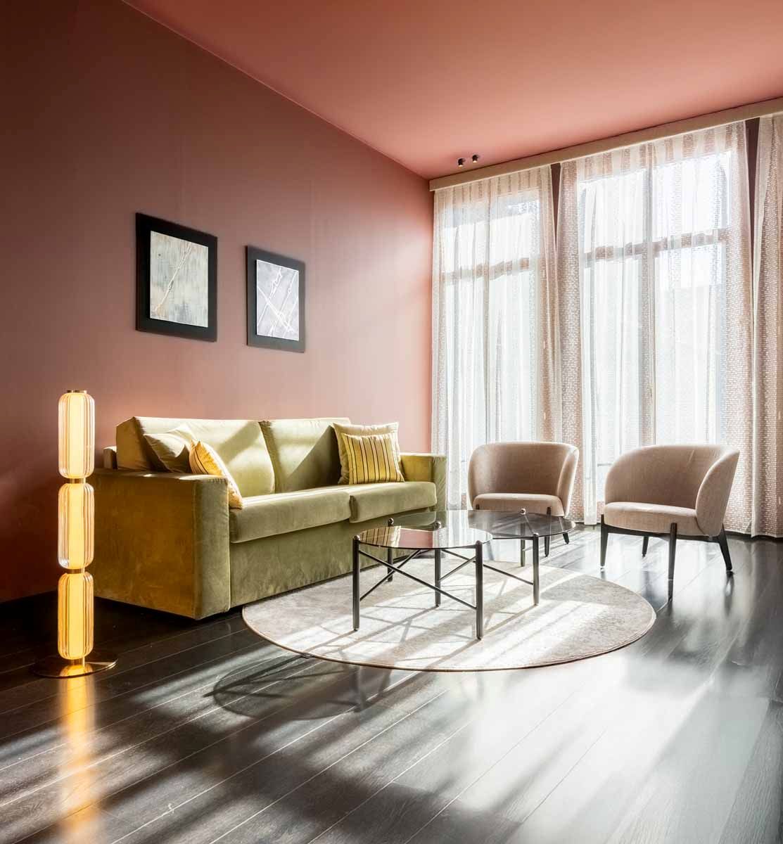 Per Palazzo Rota, le geometrie delle finiture si ispirano direttamente al maestro veneziano Carlo Scarpa, introducendo linee pulite e raffinati giochi tridimensionali che fondono rigore formale e sensibilità materica. Il progetto ha dedicato particolare attenzione alla conservazione del patrimonio storico: sono stati recuperati e valorizzati i pavimenti in seminato originale in due degli appartamenti. Altri elementi preesistenti sono stati reinterpretati, come le parti in vetro del parapetto della scala interna, trasformate in un suggestivo separé scenografico all’ingresso.