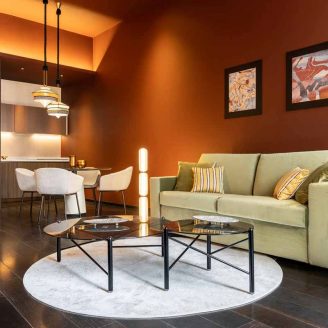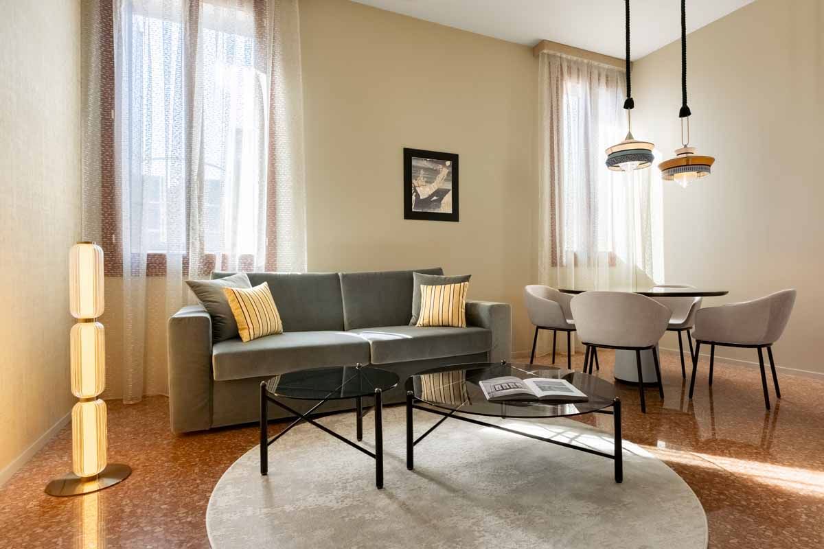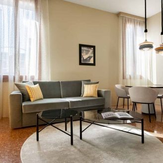 Le sei residenze, con superfici che variano dai 50 agli 80 mq, sono intime e ricercate. Ognuna è stata denominata in onore delle isole lagunari: Murano, Burano, Torcello, Sant’Erasmo, Lido di Venezia e San Giorgio Maggiore. Tutti gli appartamenti, dal primo al quarto piano, offrono il comfort di una o due camere da letto, un elegante soggiorno con divano letto, cucina completamente accessoriata e uno o due bagni. L’appartamento San Giorgio Maggiore, infine, si distingue per la presenza di una terrazza privata che regala una vista mozzafiato sui tetti e sul campanile di San Marco.