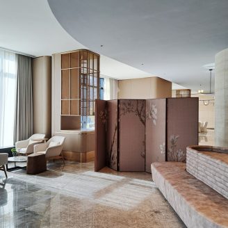 Nel progetto del Radisson Collection Lingang Shanghai la luce svolge un ruolo fondamentale, grazie agli elementi illuminanti concepiti come nuvole luminose fluttuanti in grado di conferire eleganza, dinamicità e preziosità allo spazio. Le ali sceniche di questa vasta sala a tripla altezza, così come i pilastri, sono completamente rivestiti in travertino alabastro, mentre il pavimento è caratterizzato da un intreccio di linee curve di diversi tipi di marmo pregiato. Come materiali predominanti, vediamo quindi l’utilizzo di pietra pregiata, bronzo e legno.