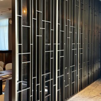 Il focus della progettazione di MMA Projects sono state le aree comuni, e nello specifico: il gigantesco atrio principale alto 19 metri, tutte le aree di servizio e gli atri degli ascensori, i numerosi ristoranti, la sala da tè, la piscina, la palestra e spa. Lo studio dell’ampia area dell’atrio principale ha visto la necessità di condurre le immense dimensioni ad una scala più a misura d’uomo e di “vestire” lo spazio per renderlo ricco. Una delle scelte estetiche ha visto l’utilizzo di una serie di “schermi” in bronzo curvato realizzati come pannelli decorativi pieni e microforati, al fine di ottenere effetti diversi a seconda del punto di osservazione. Considerando le dimensioni imponenti dell’ingresso, lo spazio è stato progettato come un elemento dinamico attraversabile grazie alla realizzazione di una passerella che rompe verticalmente la vasca di acqua, dando vita a un elemento scenografico centrale composto da una fontana e un grande bancone d’accoglienza in pietra. Il passaggio consente di attraversare lo spazio e di accedere all’area del piano bar, dove le sedute sono posizionate a un livello inferiore rispetto al piano di attraversamento, dando l’impressione di immergersi in una piscina.