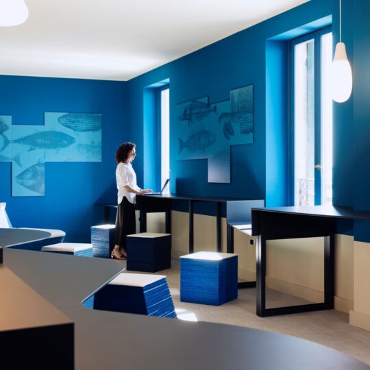 L’edificio ristrutturato è uno spazio collettivo dedicato a studio, lavoro e incontro, dove azzurro e blu sono i toni che dominano le pareti dei vani scala e degli spazi comuni recuperando le memorie stratificate nell’edificio.