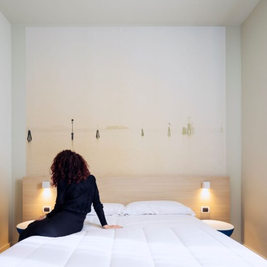 L’eco della laguna e del Mediterraneo viene trasferita sulle pareti delle stanze, attraverso le interpretazioni fotografiche di Salvatore Greco, Mario Ferrara, Luc Boegly e Stefano Anzini, stampate a pieno campo sulle pareti testa letto, mentre setti arretrati sostengono la superficie orizzontale dei letti, creando un suggestivo effetto sospeso.