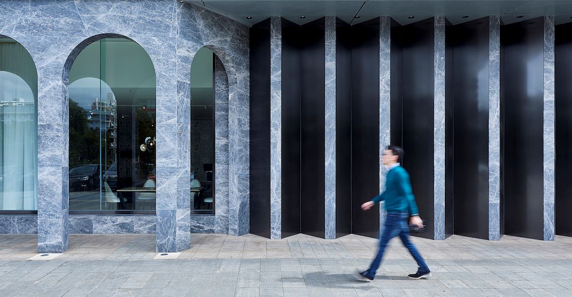Interamente rivestiti in marmo grigio, nella facciata esterna gli archi vanno a definire degli ampi porticati dall’immediato impatto visivo, per dare riconoscibilità, atmosfera e creare uno spazio ideale per passeggiare: l’obiettivo è ricreare i percorsi sotto i portici tipici delle cittadine italiane, dando alle persone la sensazione del Bel Paese e, allo stesso tempo, invitandoli ad avvicinarsi alle vetrine.