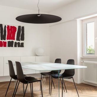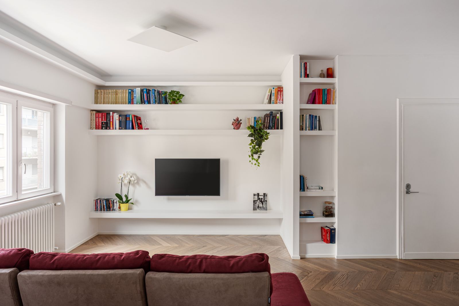 In tutto l’ambiente prevalgono i colori neutri, studiati per enfatizzare la fluidità e la luminosità degli ambienti. L’unico elemento che spezza, spiccando così subito all’occhio, è il grande divano color porpora. A caratterizzare l’ambiente sono anche le librerie, simbolo di elegante fusione tra architettura e arredo, che sono ricavate direttamente nella parete.