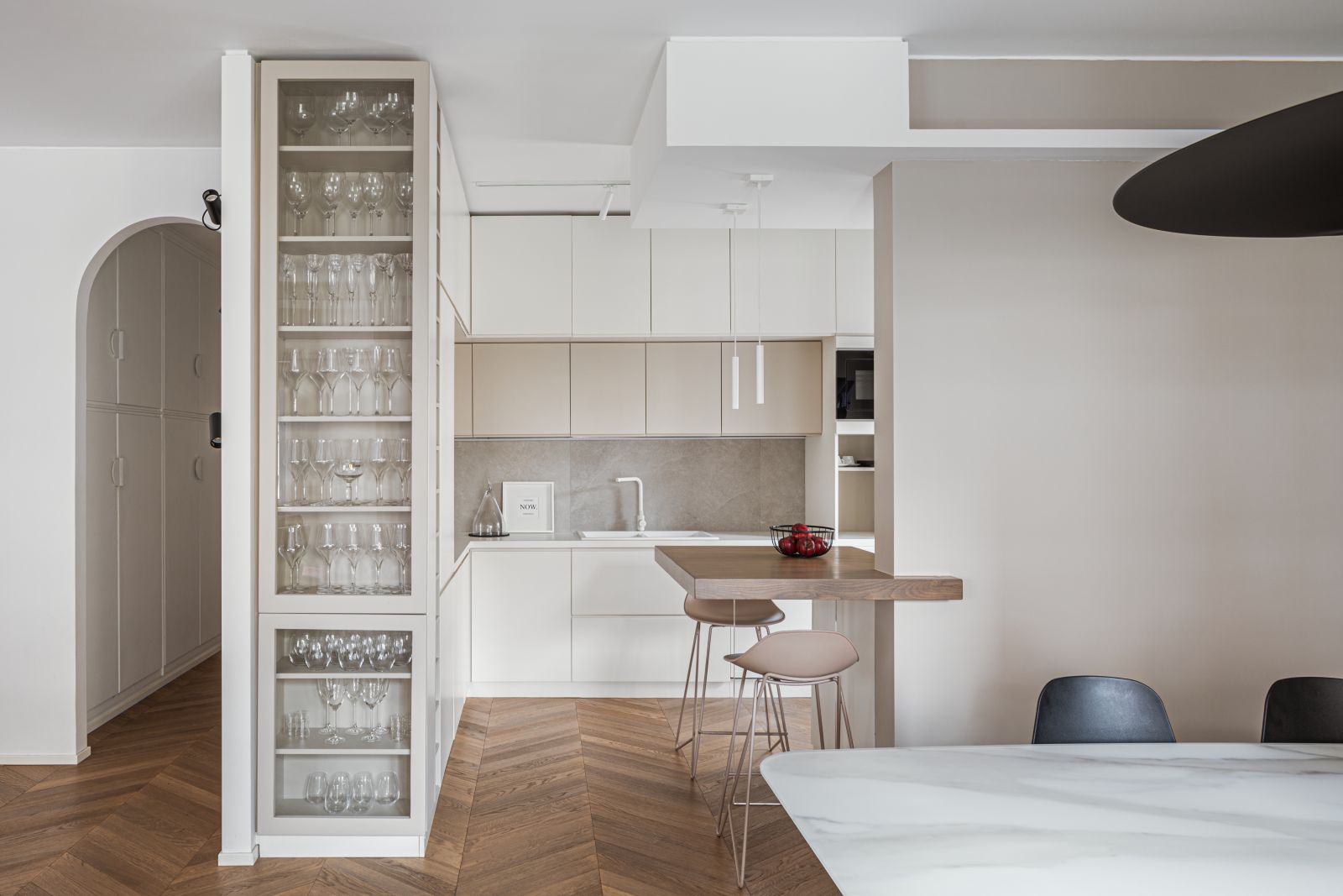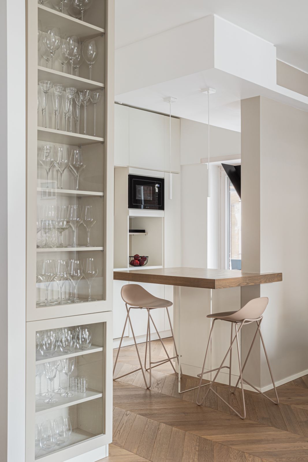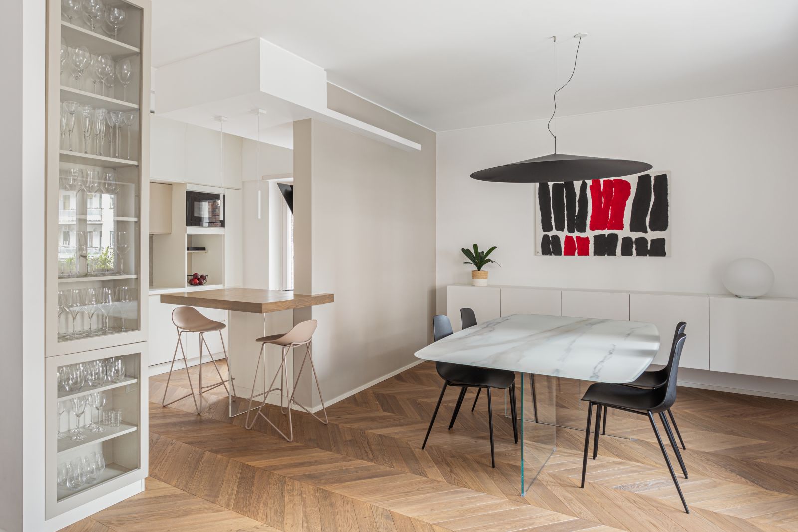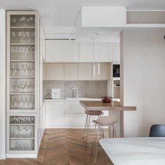 A dividere la zona living con la cucina vi è un grande bancone snack in rovere, la cui cromia richiama il pavimento, caratterizzato da una colonna-vetrina a tutt’altezza, che trasforma un elemento funzionale in un dettaglio scenico divenendo una sorta di cabinet de curiosités domestico.