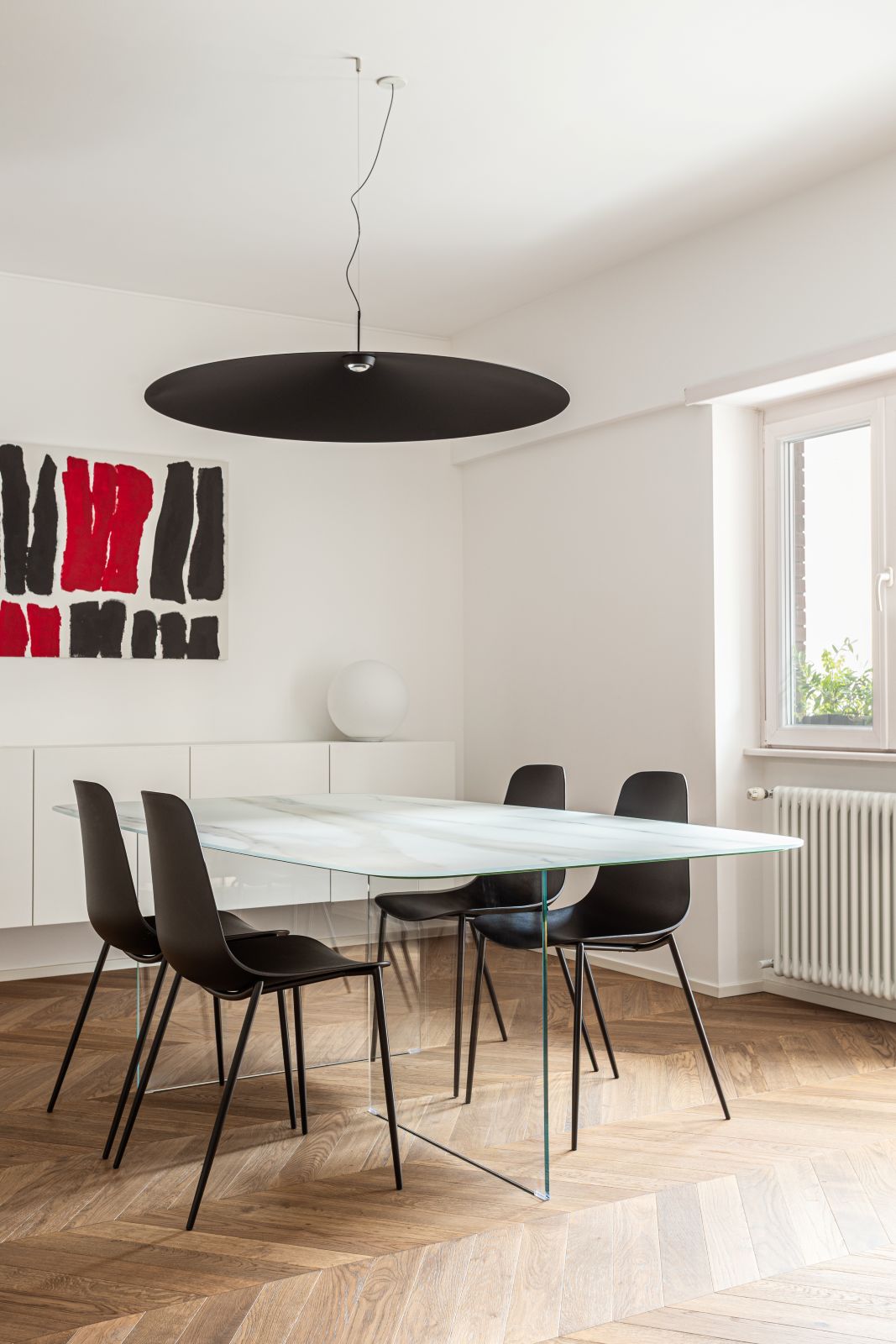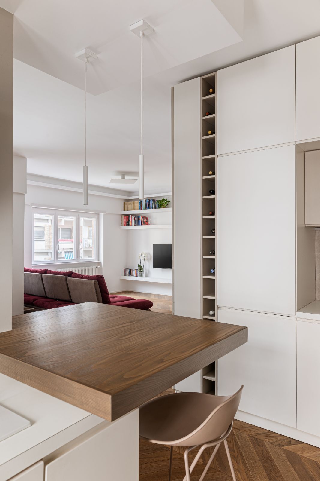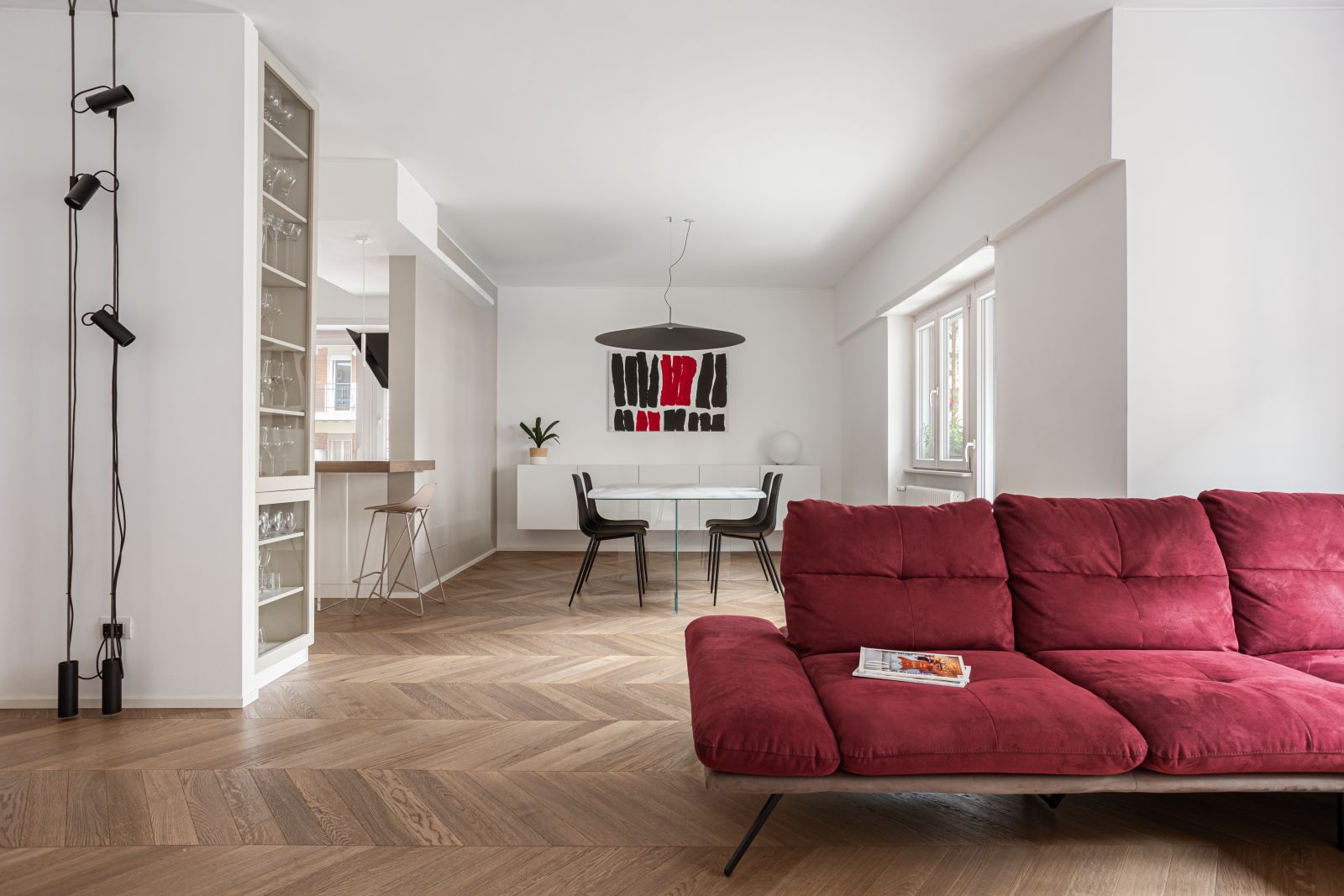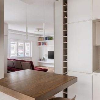 A dividere la zona living con la cucina vi è un grande bancone snack in rovere, la cui cromia richiama il pavimento, caratterizzato da una colonna-vetrina a tutt’altezza, che trasforma un elemento funzionale in un dettaglio scenico divenendo una sorta di cabinet de curiosités domestico.