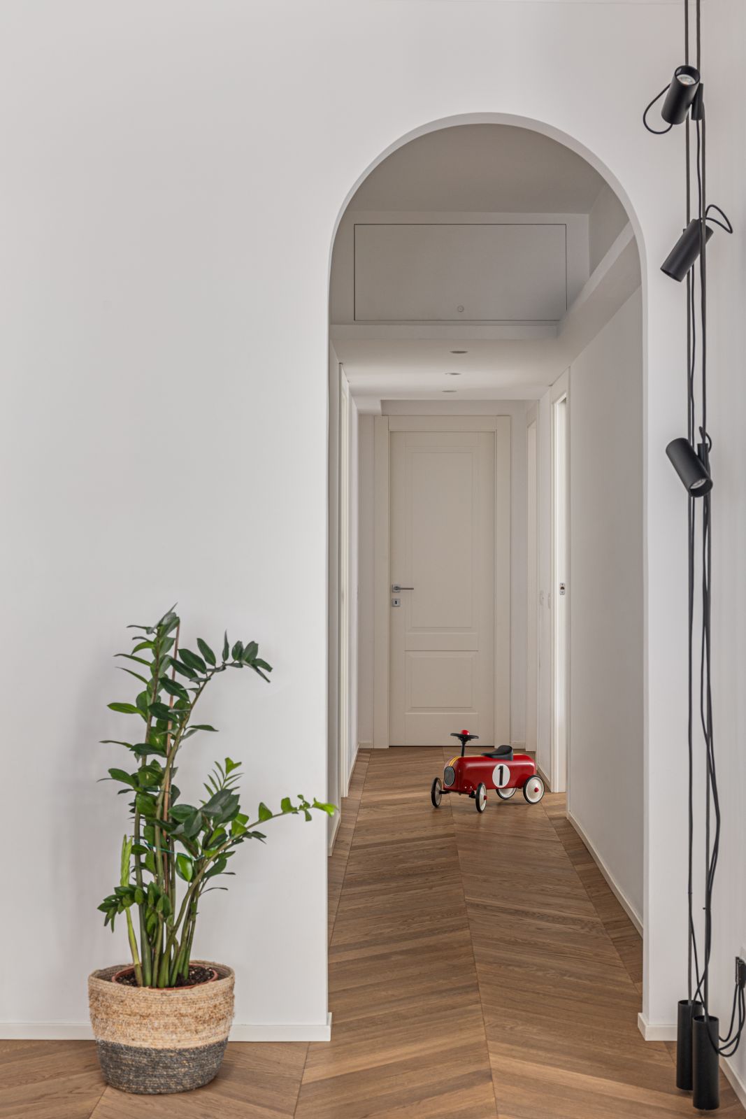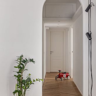 Fil-rouge di tutto il progetto è il pavimento in legno caratterizzato da una pregiata posa a spina ungherese che – con la sua decisa direzionalità – orienta lo sguardo e accompagna il movimento verso la zona notte, introdotta da un suggestivo varco ad arco. Realizzato con il parquet Rovere Cumino della collezione Dream di Woodco, il rivestimento non solo infonde calore e autenticità agli interni, ma contribuisce a creare un continuum visivo, favorendo un utilizzo fluente e dinamico dello spazio.
