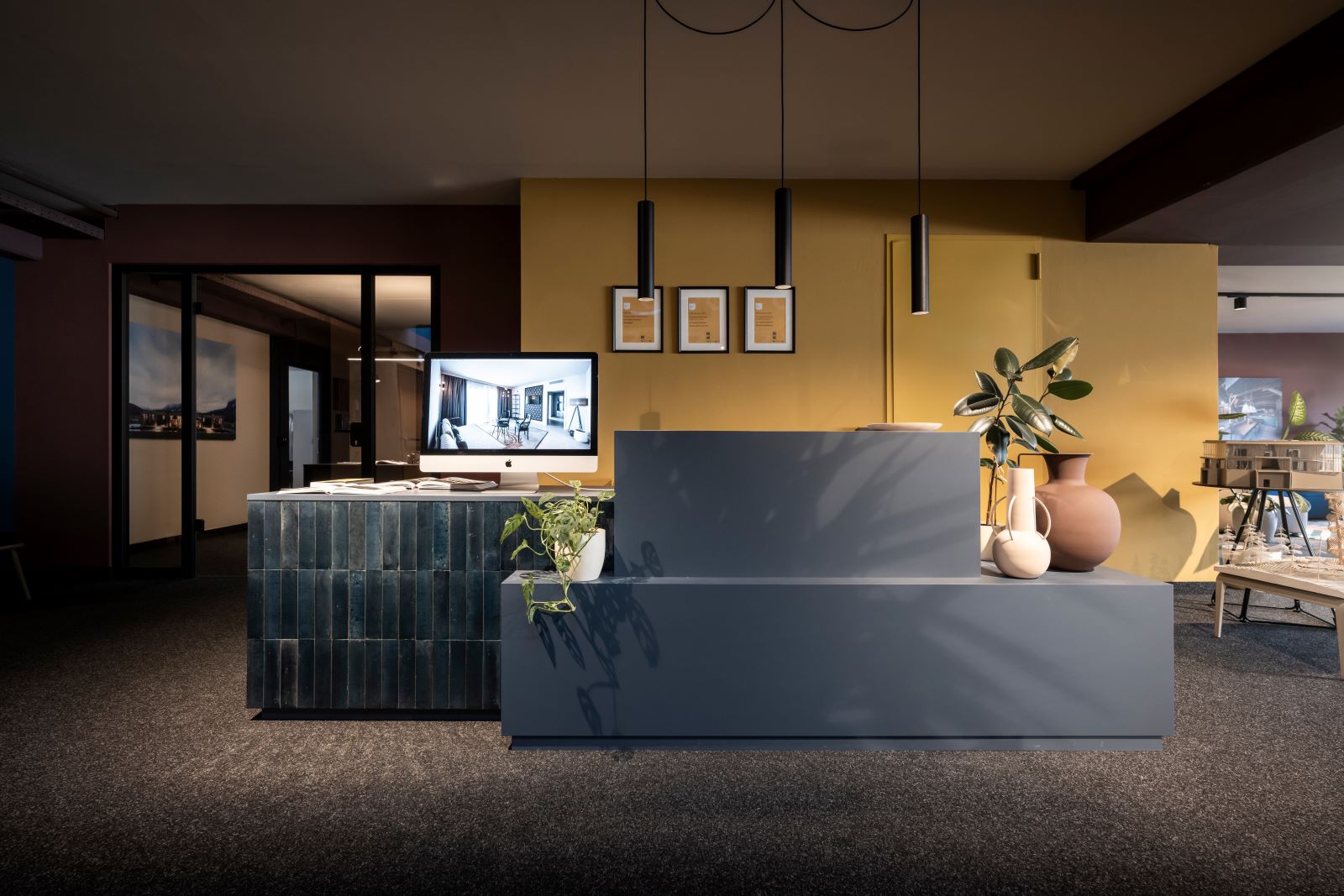 Estremamente coinvolgente nella lobby, ma onnipresente in tutto l’ufficio, è lo schema di sei colori che conferisce all’ambiente una narrazione compositiva e lo trasforma in un luogo dall’esperienza sensoriale profonda. La decisione di aggiungere una ricchezza cromatica allo spazio ha diverse motivazioni: da una parte, la fiducia maturata negli anni che l’uso di particolari combinazioni di colore regali agli interni un’identità immersiva. Ne sono un esempio i progetti di Weisses Kreuz e Aeon. Dall’altra, il desiderio di utilizzare le sei tinte di colore come un codice per rappresentare le diverse identità che costituiscono NOA (attivo nei settori dell’urbanistica, architettura, interni, arredamento, illuminazione e design del prodotto). E infine, la capacità del colore di mettere in evidenza e valorizzare ogni singolo elemento architettonico, sia esso una vecchia trave, una nuova parete o un solaio adattato, creando quindi un insieme spaziale simile ad un palcoscenico.