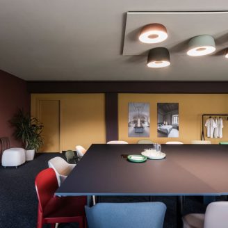 Alla lobby segue da un lato un open space dedicato ad architetti ed interior designer, mentre dall’altro una sala meeting per 20 persone. Nel layout di pianta trovano spazio anche una cucina, una spaziosa materioteca, una cartoleria, due ulteriori uffici, quattro sale meeting di dimensioni più contenute rispetto alla principale, tre nuclei di servizi, una sala per archivio stampa e una dedicata all’informatica. Un tavolo da ping-pong completa l’offerta. Tutti questi spazi hanno una caratteristica in comune: possono essere trasformati in altre funzioni a seconda delle esigenze, generando così un alto livello di valore aggiunto.
