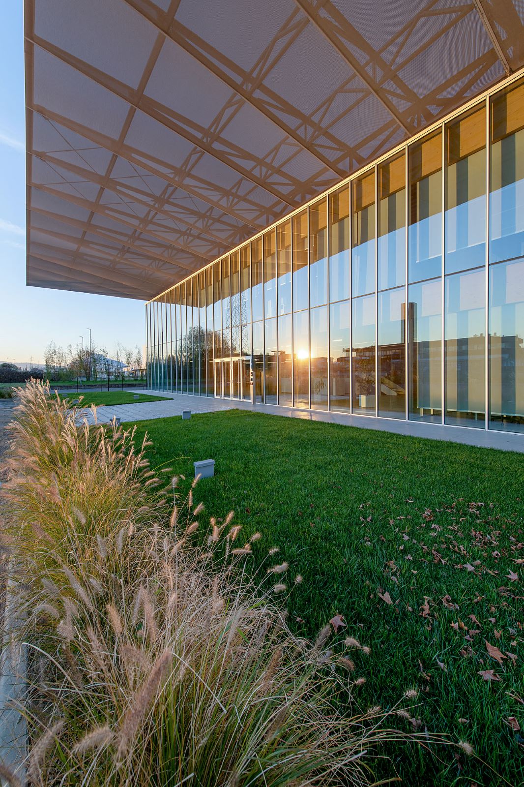 Una grande vela di copertura che diventa l’elemento caratterizzante dell’intervento, aggettante rispetto al filo esterno dell’edificio, con sbalzi differenti a seconda dell’orientamento e dell’analisi solare per modulare la luce e la radiazione sulle facciate trasparenti.