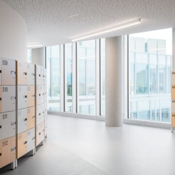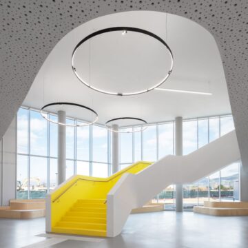 Le due scale principali, infatti, sono i cuori pulsanti del progetto degli interni: connotati da una doppia altezza, rappresentano i luoghi di connessione verticale, dove è possibile per gli studenti tessere relazioni e crescere al di là dell’aula. Una palestra certificata CONI ed un auditorium flessibile completano la dotazione della scuola.
