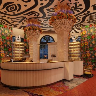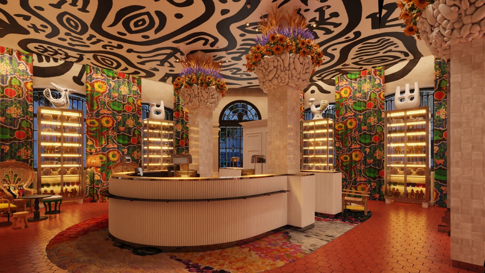 In tutta la proprietà, El Doghaïli esprime il suo amore per le tonalità luminose e vibranti, sposando il giallo zafferano, l’ocra rossa, il blu oltremare e il verde oliva di Nizza, ispirandosi alle palette di colori dei pittori impressionisti. In collaborazione con artisti e artigiani di talento come Lola Mercier e Beniloys, bouquet di frutta, fiori e ortaggi mediterranei – come la lavanda, il girasole e il papavero di grano – decorano la punta delle colonne impreziosite da capitelli in gesso, ricordando lo stile di una natura morta di Van Gogh. Al centro del ristorante, un bancone in legno d’ulivo domina su un pavimento di piastrelle in terracotta, mentre sculture luminose sospese, ispirate alle luci che rischiarano le strade in festa, illuminano la sala.