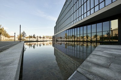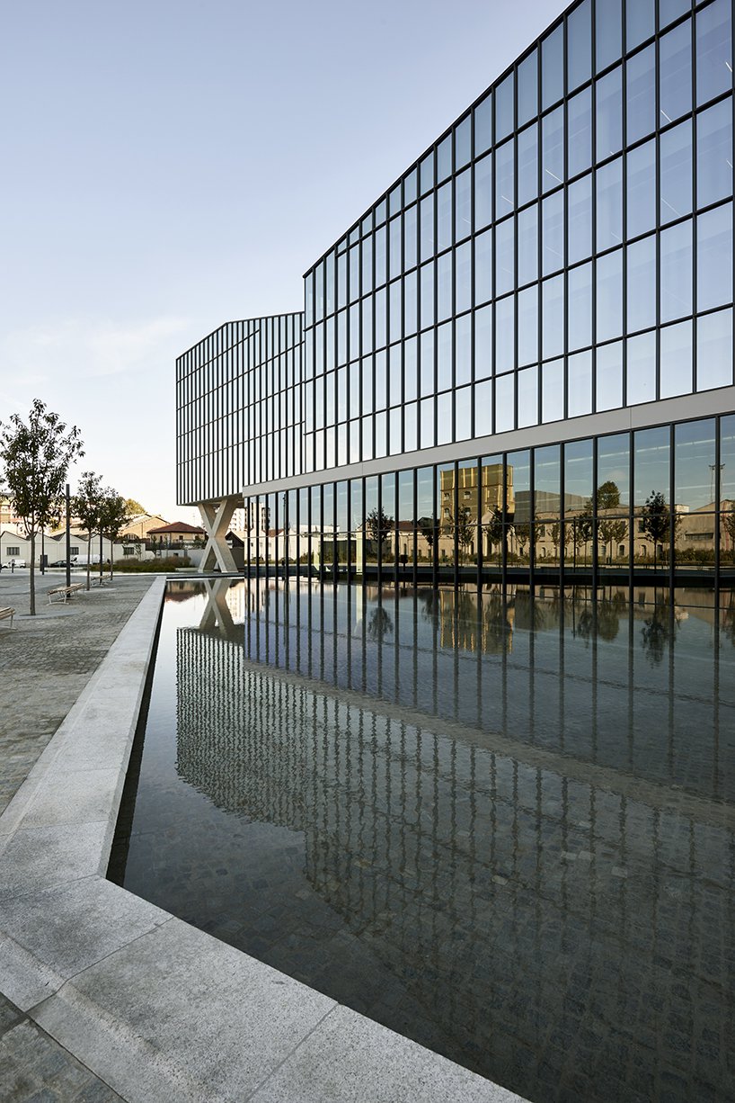 Il complesso uffici è progettato per creare un’identità e un rapporto unici con il contesto costituito dal business park e dal paesaggio urbano circostante: l’edificio è caratterizzato da ampie facciate in vetro, che mirano a collegare gli spazi ufficio con le aree d’incontro esterne, e l’elemento vetrato è a sua volta esaltato dagli specchi d’acqua che riflettono la superficie in vetro.