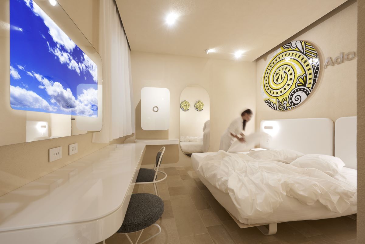 Nella camere i letti sembrano delle bolle sospese che, grazie all’illuminazione colorata, donano al visitatore una sensazione di leggerezza. L’unione col bagno è data dalla pietra che riveste i pavimenti delle camere e che entra nei bagni “invadendo” questo ambito spaziale. Anche in questo caso i colori sono tenui e omogenei mentre l’unica nota di colore è data dal lavabo che richiama i toni che caratterizzano le decorazioni presenti in ogni stanza.