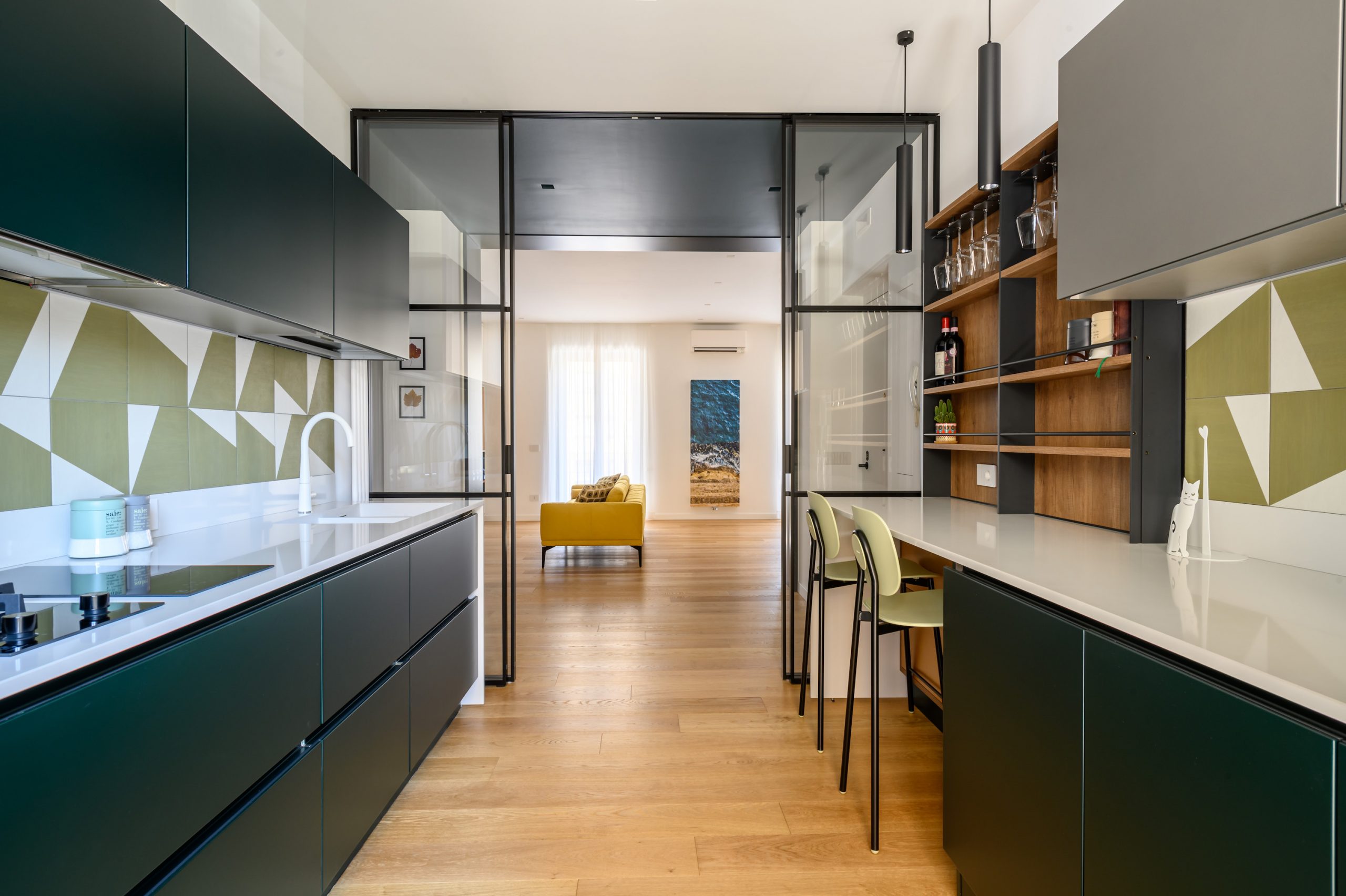 Da un punto di vista estetico l’appartamento ha visto un uso sapiente e studiato del colore giocato sui toni del giallo e del verde inglese. Gli arredi, le armadiature su misura e le pareti dialogano così tra loro in un’armonia cromatica fatta di contrasti e sovrapposizioni.