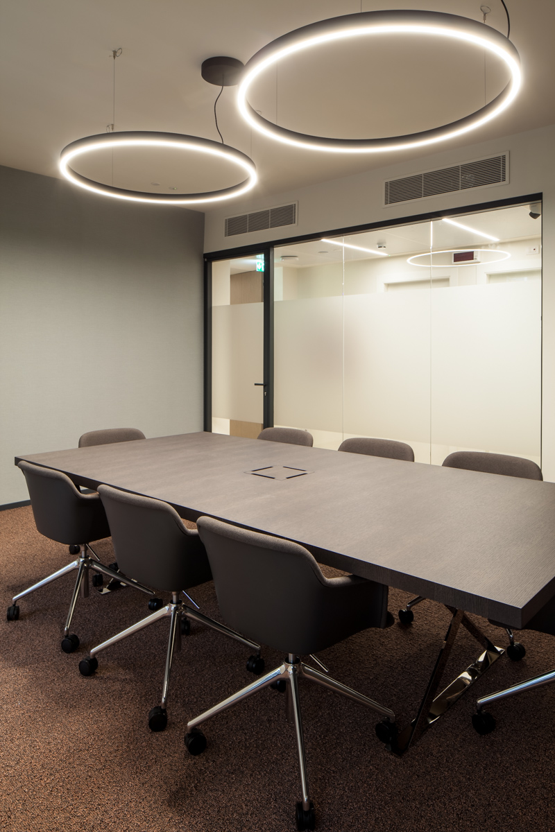 Infatti, come previsto dal progetto, sono stati forniti e installati corpi illuminanti in coerenza con i requisiti di comfort luminoso relativi agli spazi di lavoro e non, utilizzando lampade tecniche e lineari per le varie postazioni e corpi illuminanti decorativi dalle linee più morbide per la sala riunioni e l’area break.