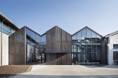 Le facciate vetrate, pensate dallo Studio Tortato, con la tecnologia Schueco e sviluppate con l’esperienza di Amitti, sono ritmate da parti opache in corten, un materiale già presente all’interno della Forgiatura ma interpretato in modo innovativo, in modo da caratterizzare l’edificio come nuovo rispetto agli altri: in particolare l’utilizzo della lamiera microforata a schermatura delle parti maggiormente esposte al sole, conferisce carattere al nuovo intervento ed è al tempo stesso un valido contributo nell’ottenimento del miglior comfort possibile all’interno dell’ambiente, riducendo così i consumi della climatizzazione.