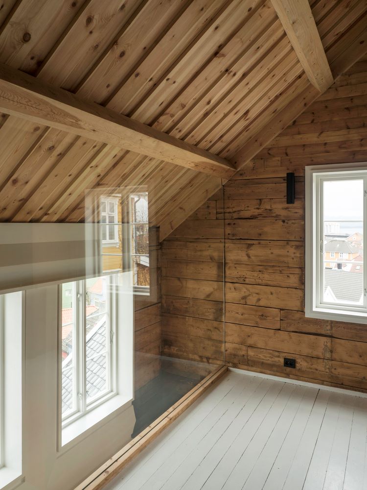 Nel quadro di un’ampia opera di ristrutturazione ed ampliamento, lo studio di architettura Hoem + Folstad Arkitekter ha scelto di valorizzare questa antica storia conservando le pareti in legno, persino quelle danneggiate dal fuoco, che sono state restaurate e sono diventate un elemento di carattere degli interni.