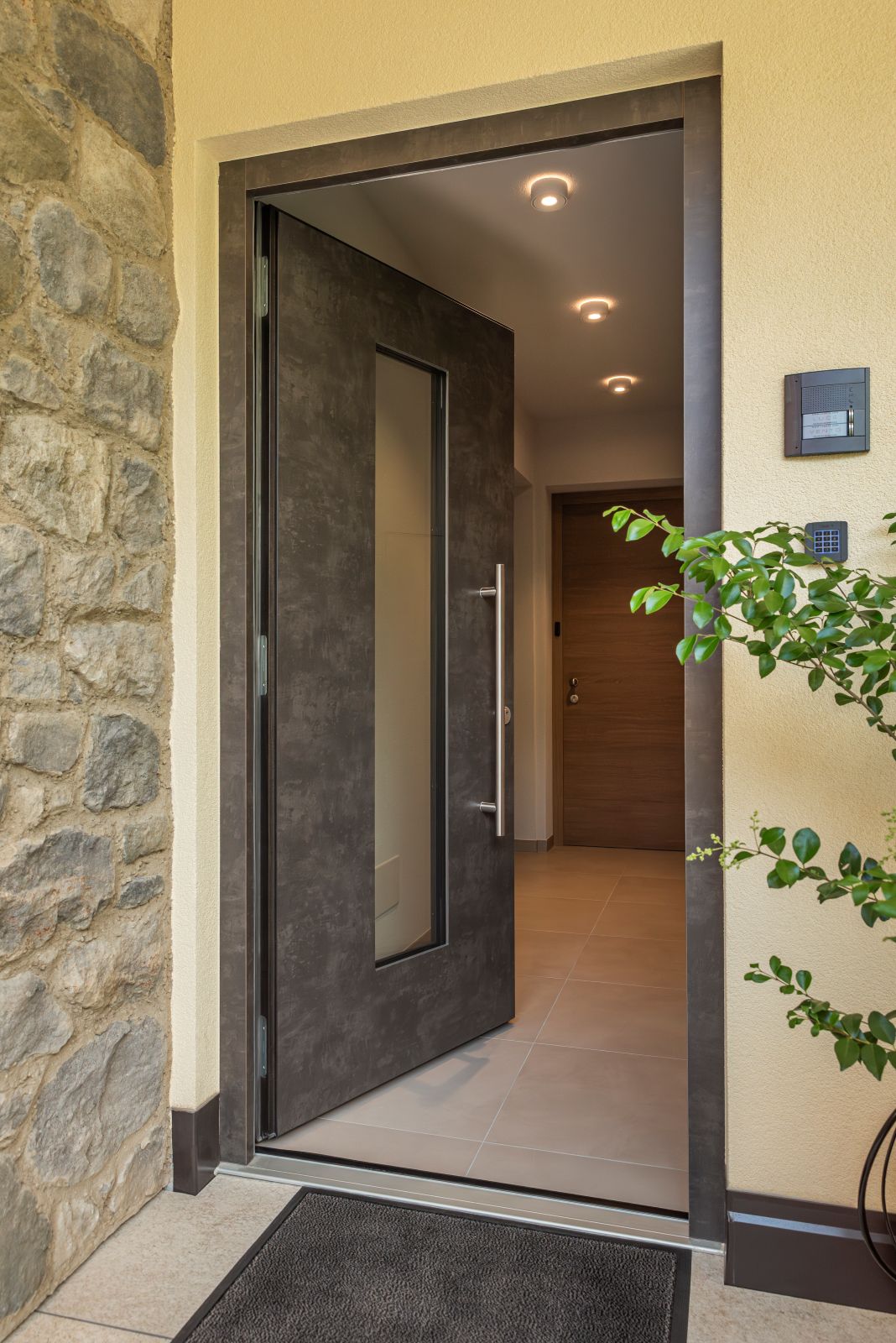 Il rapporto con il paesaggio circostante è mediato da oltre 100 metri quadrati di terrazze panoramiche, concepite come l’autentico fulcro della vita domestica in ogni stagione. Un dettaglio architettonico di rilievo è rappresentato dalla colonna centrale rivestita in pietra, che si interrompe volutamente prima del colmo del tetto autoportante per liberare la visuale verso lo specchio d’acqua. La coerenza estetica prosegue negli spazi outdoor, dove la progettazione del verde ha previsto la salvaguardia di quattordici ulivi secolari e l’impiego di muretti a secco in pietra naturale ricostruita, in pieno accordo con la tradizione costruttiva gardesana.