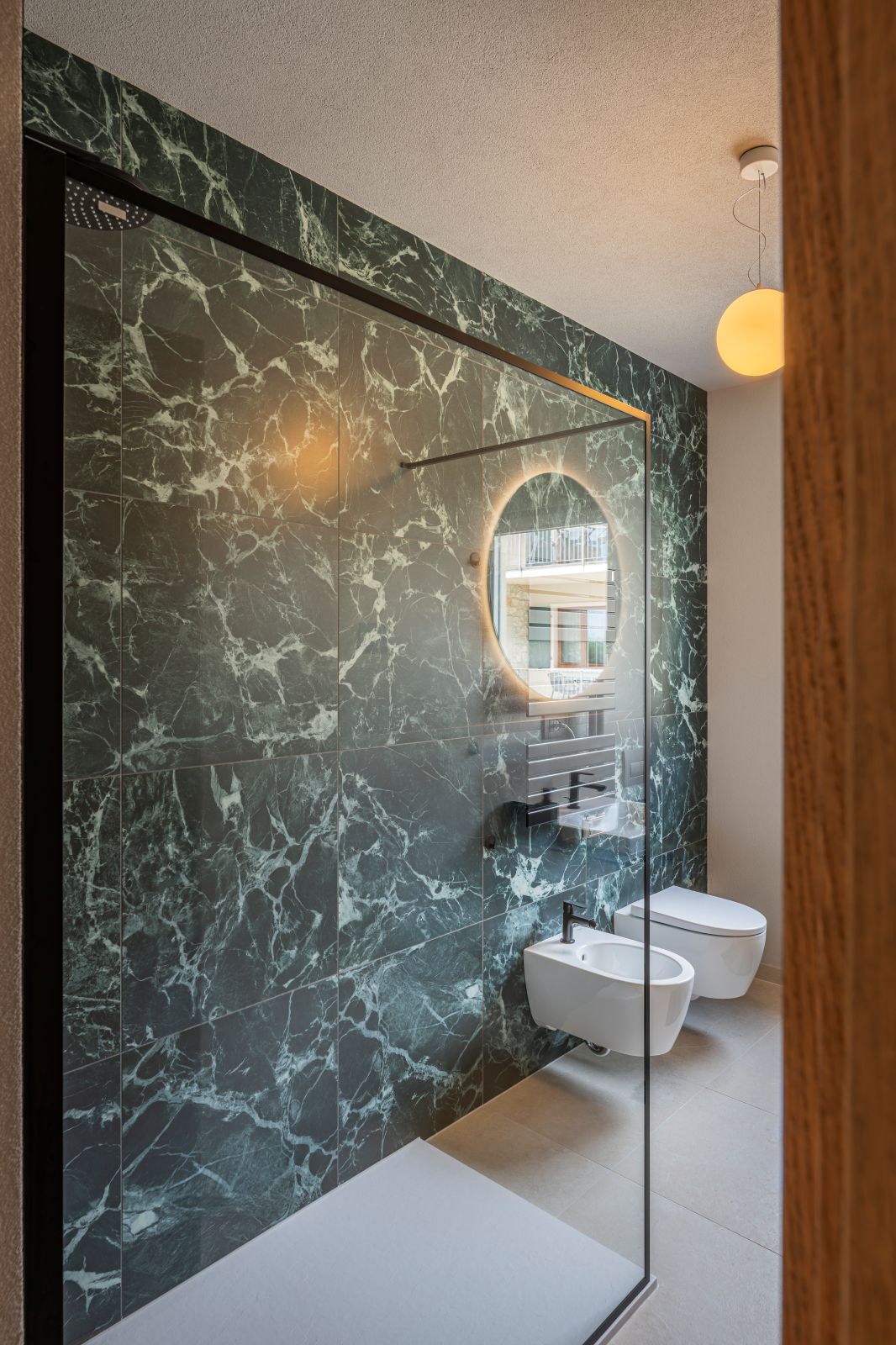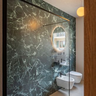 Gli interni di LAGETA Apartments riflettono un design funzionale e ricercato, dove il gres porcellanato dei pavimenti incontra la precisione delle cucine firmate Veneta Cucine e rubinetterie in nero opaco. L’illuminazione si avvale di grandi classici del design scandinavo e pezzi iconici come la “Fil de Fer” di Catellani & Smith, mentre un sistema domotico avanzato gestisce in remoto climatizzazione, luci e accessi smart. Un aneddoto significativo riguarda il riuso del legno di una pigna abbattuta, trasformato in arredi per gli appartamenti, a testimonianza di una sensibilità progettuale che non dimentica la storia del luogo.