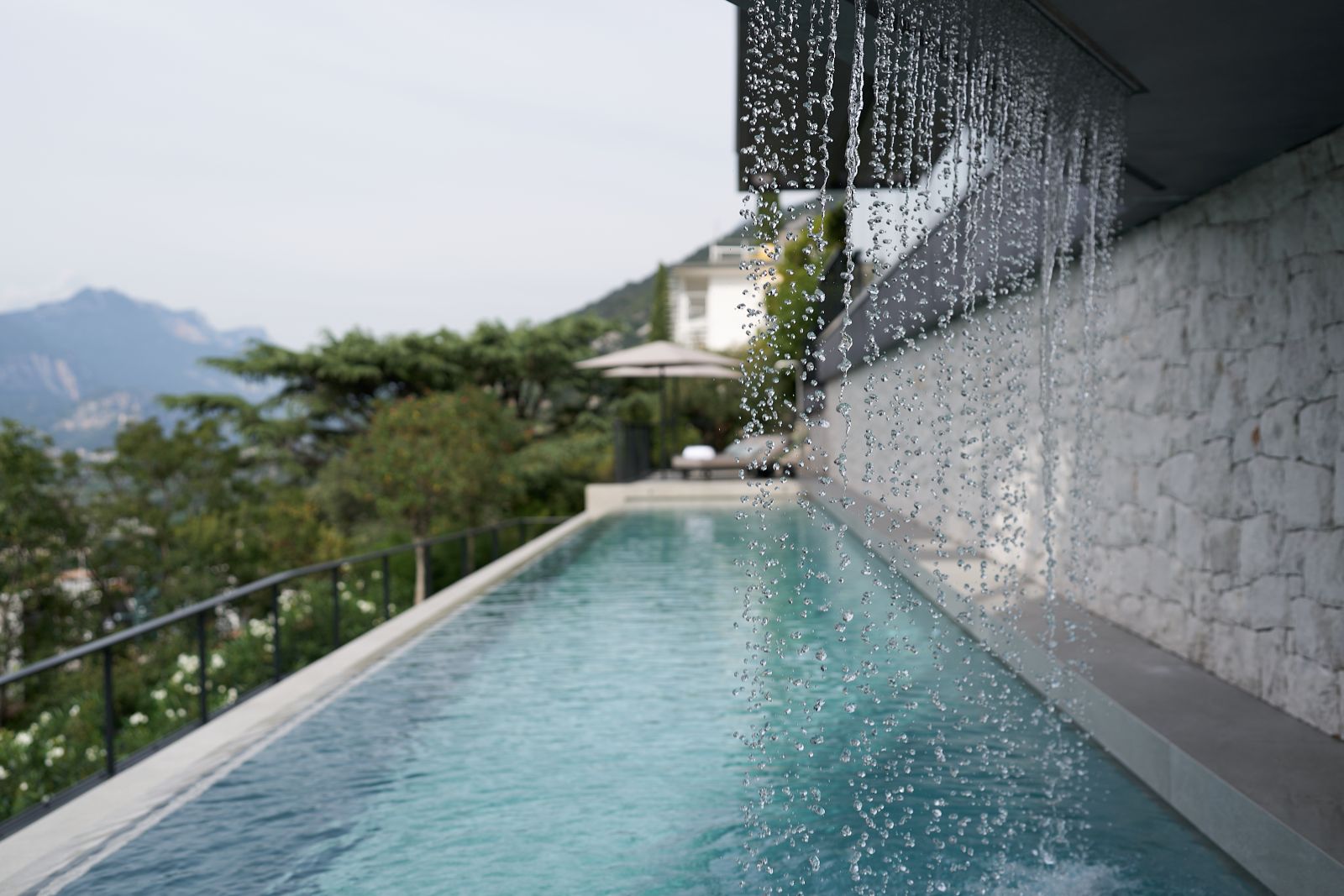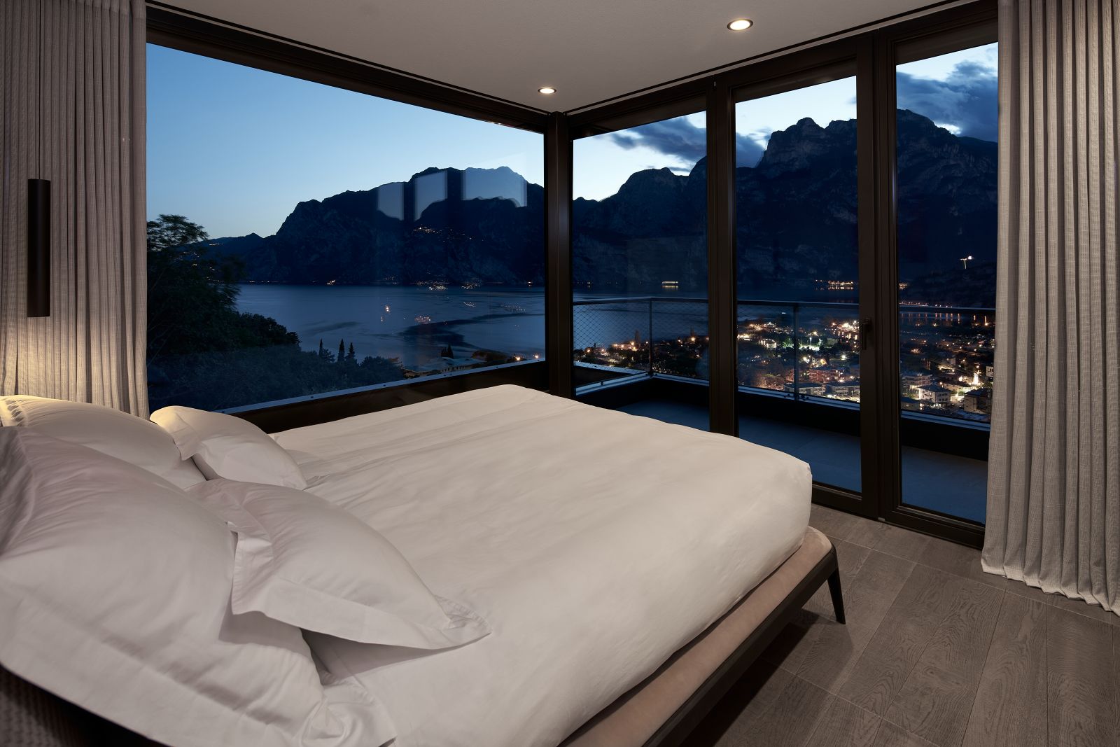Il sito di costruzione si presentava come un ripido pendio calcareo, ma la sua esposizione a sud-ovest garantiva una vista aperta e spettacolare sul lago. Per superare la sfida topografica, Rubner Haus ha adottato una struttura a terrazze. L’architettura combina l’uso del legno, impiegato per la struttura portante e i rivestimenti interni, con materiali autoctoni, tra cui la pietra calcarea locale, il calcestruzzo a vista e ampie superfici vetrate. Il risultato è un organismo costruttivo che dialoga in sintonia con l’ambiente circostante.