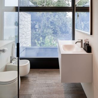 L’edificio si sviluppa su due livelli. Al piano superiore sono situate le camere da letto, ciascuna con balcone e affacciata sulla valle, dotate di un tetto pensato per filtrare la luce. Il piano inferiore ospita, invece, la zona giorno, concepita per essere ampia e luminosa, e che si estende fluidamente verso l’esterno. Le terrazze esterne e la piscina a sfioro sono state integrate come componenti essenziali dell’architettura grazie alla coerenza dei dettagli e all’uso sapiente della materia.